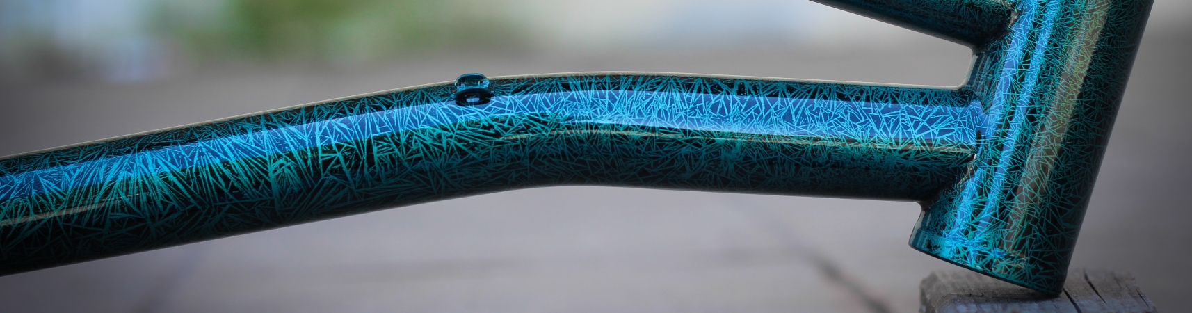 Trailově orientovaný rám v tyrkysovém provedení oblíbeného camouflage designu.