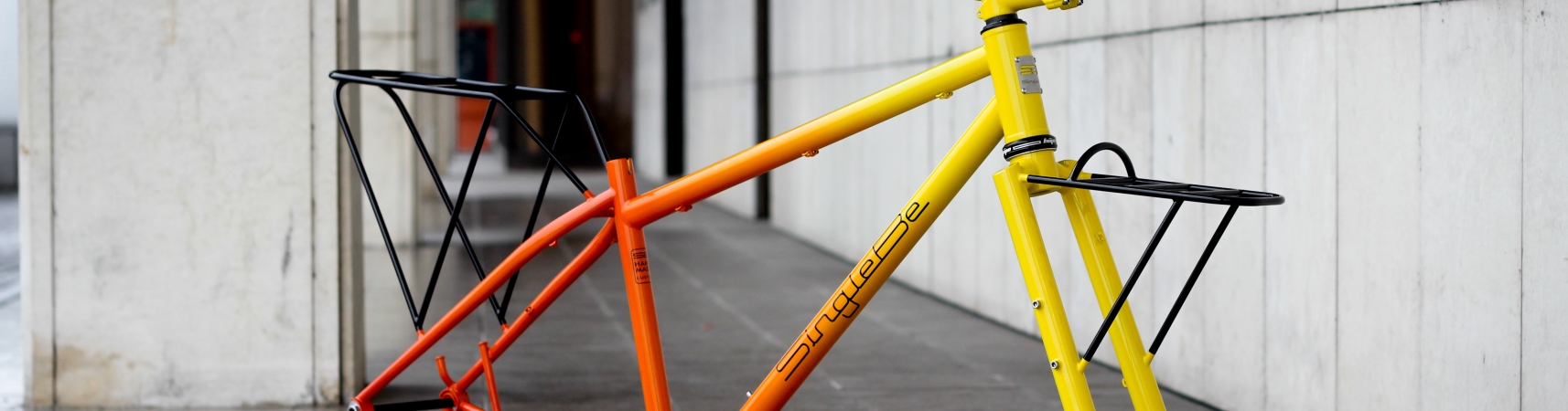 Custom tourer frame set equipped with integrated front rack and full length painted fenders.
