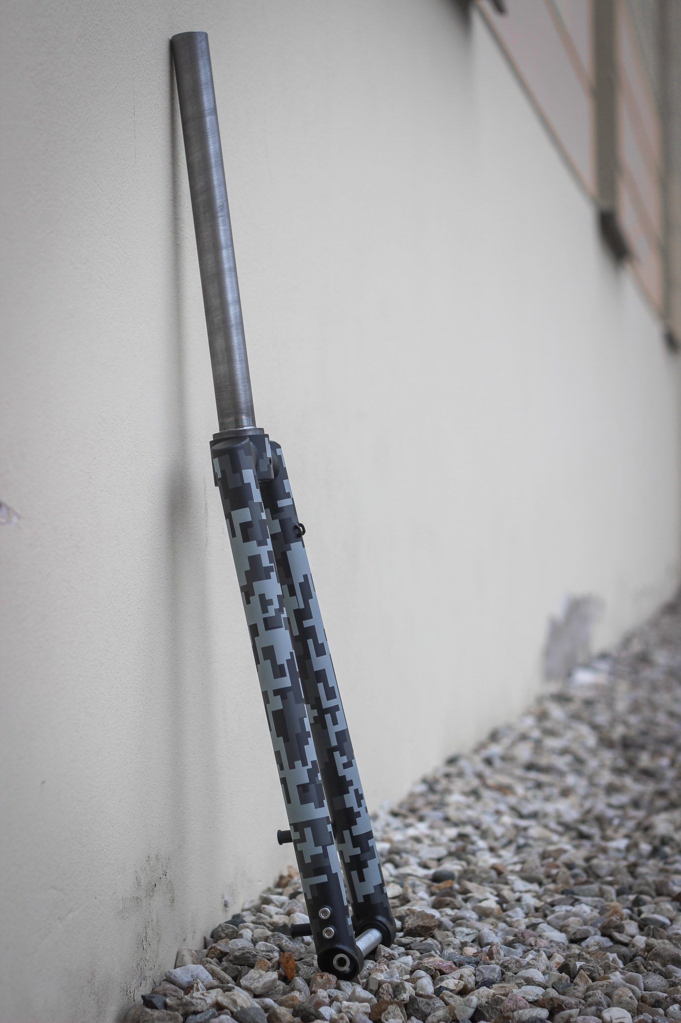 We manufacture “segmented” steel forks from CrMo SAE4130 steel. Optional Axle to crown length (max 490 mm) and offset.