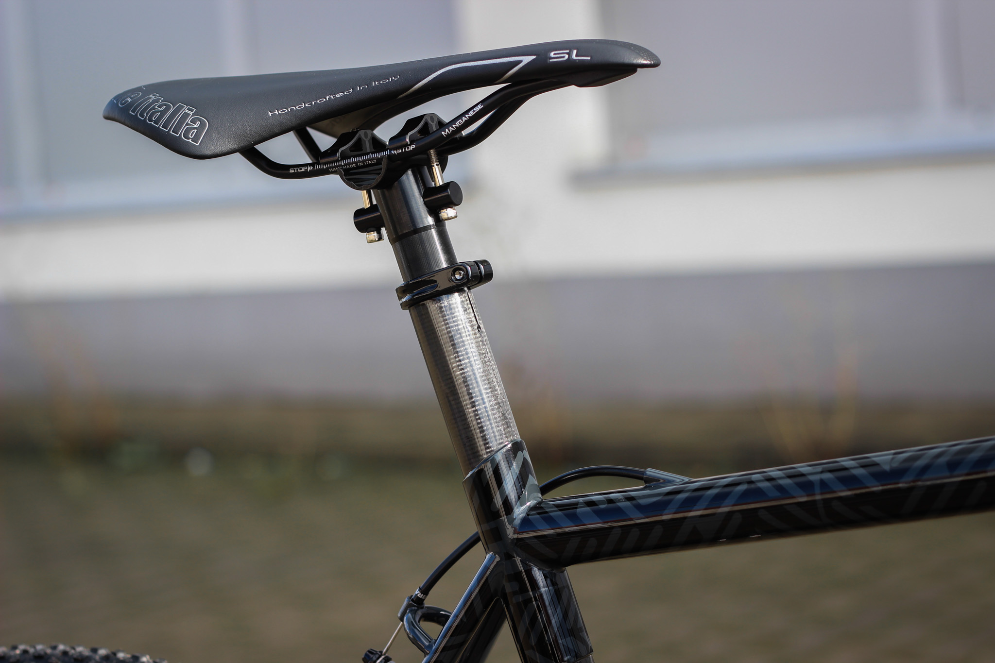 Standard 27.2 seatpost is inserted to carbon fibre seat tube. Seat post is cut to sufficient length.