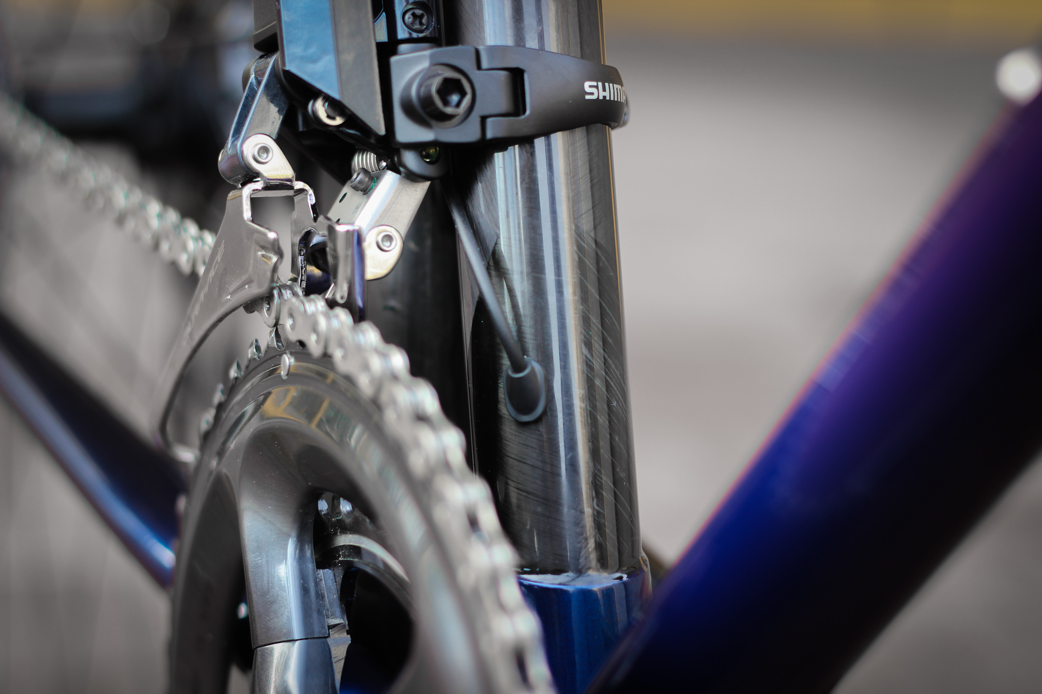 Internal cable Di2 routings from the Junction Box Shimano SM-EW90 thru the down tube and further to the battery, which is at the top of seat tube.
