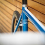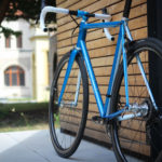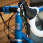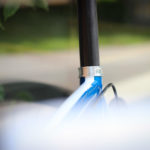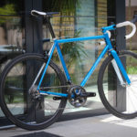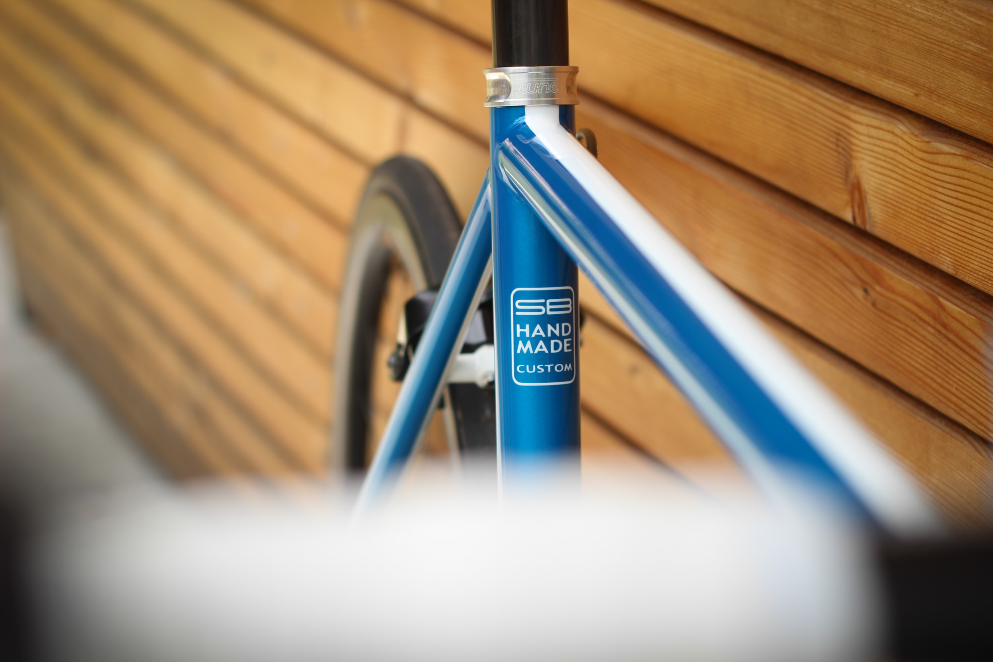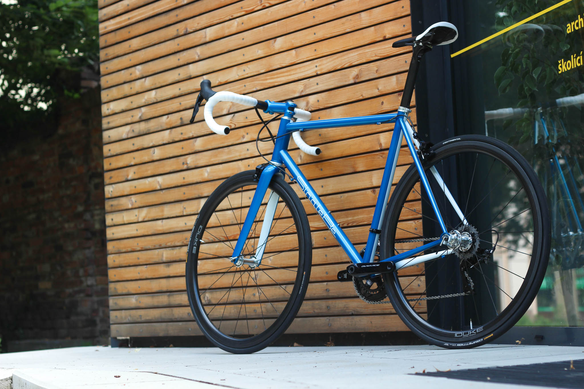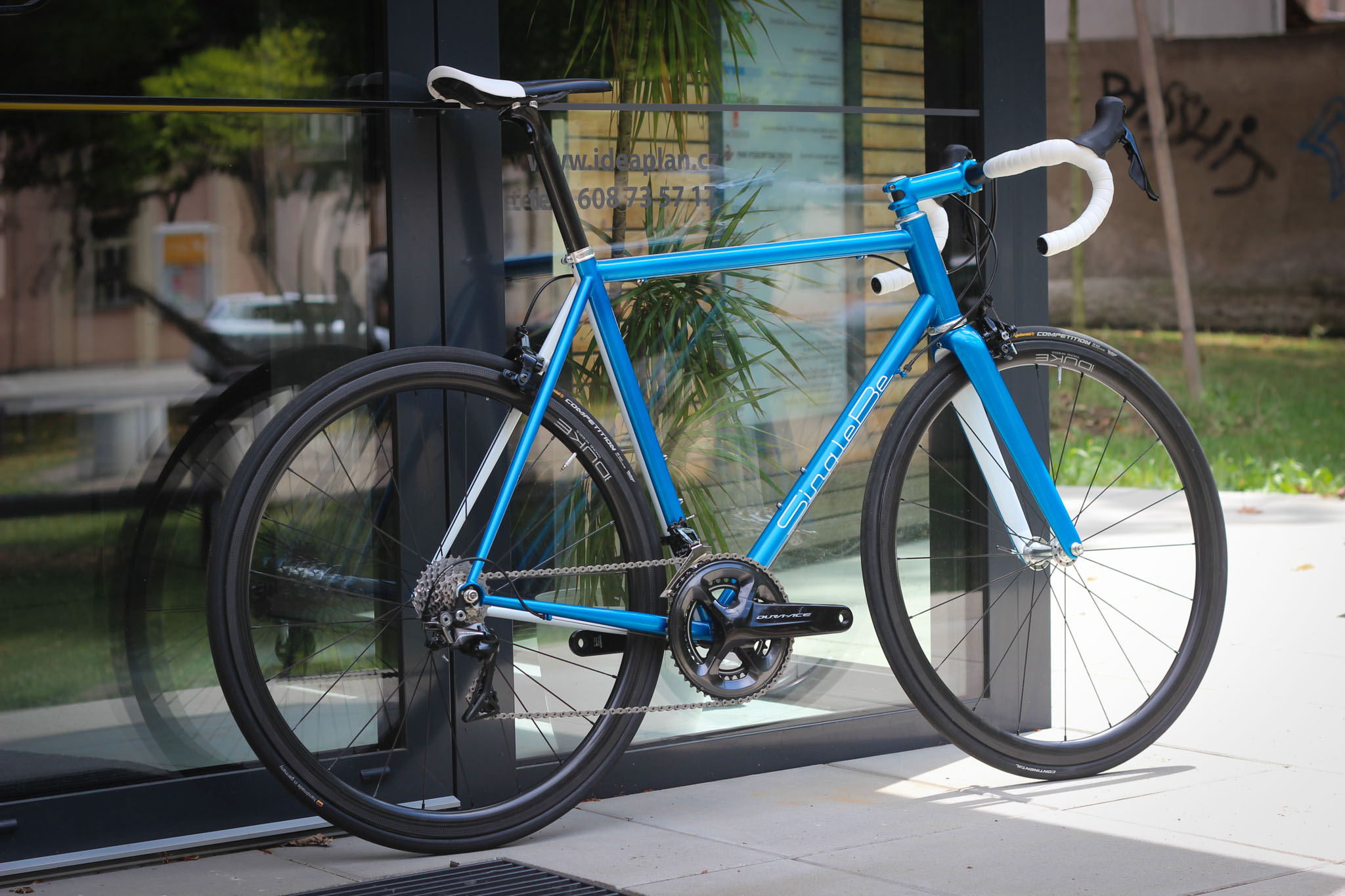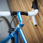 Main frame color is candy blue over blue metallic base paint. White stripes and white parts bring the bike that really light look. Custom painted carbon Trigon stem is holding super comfy Trigon aero full carbon road bars.