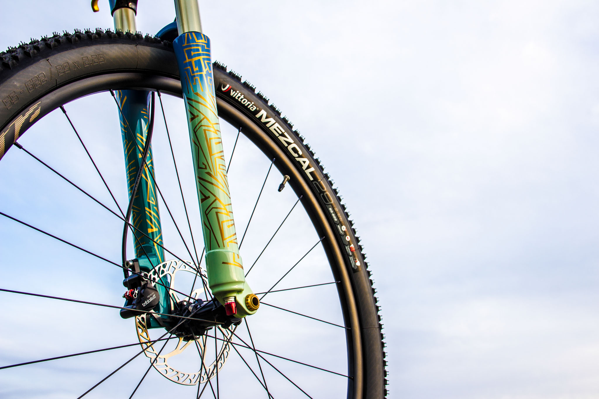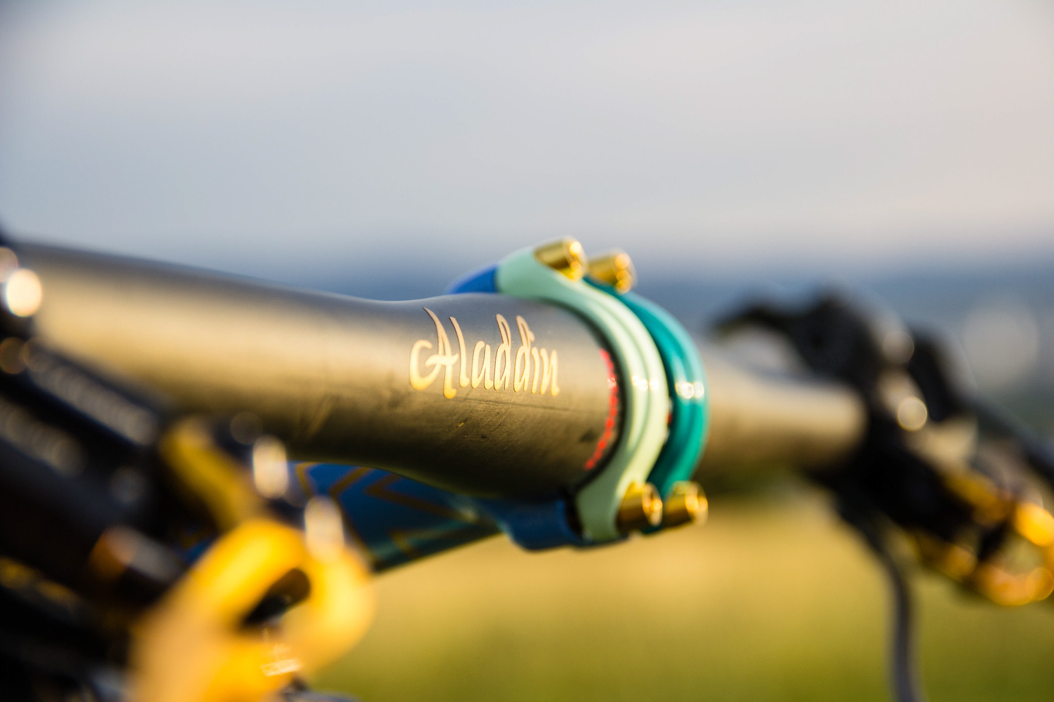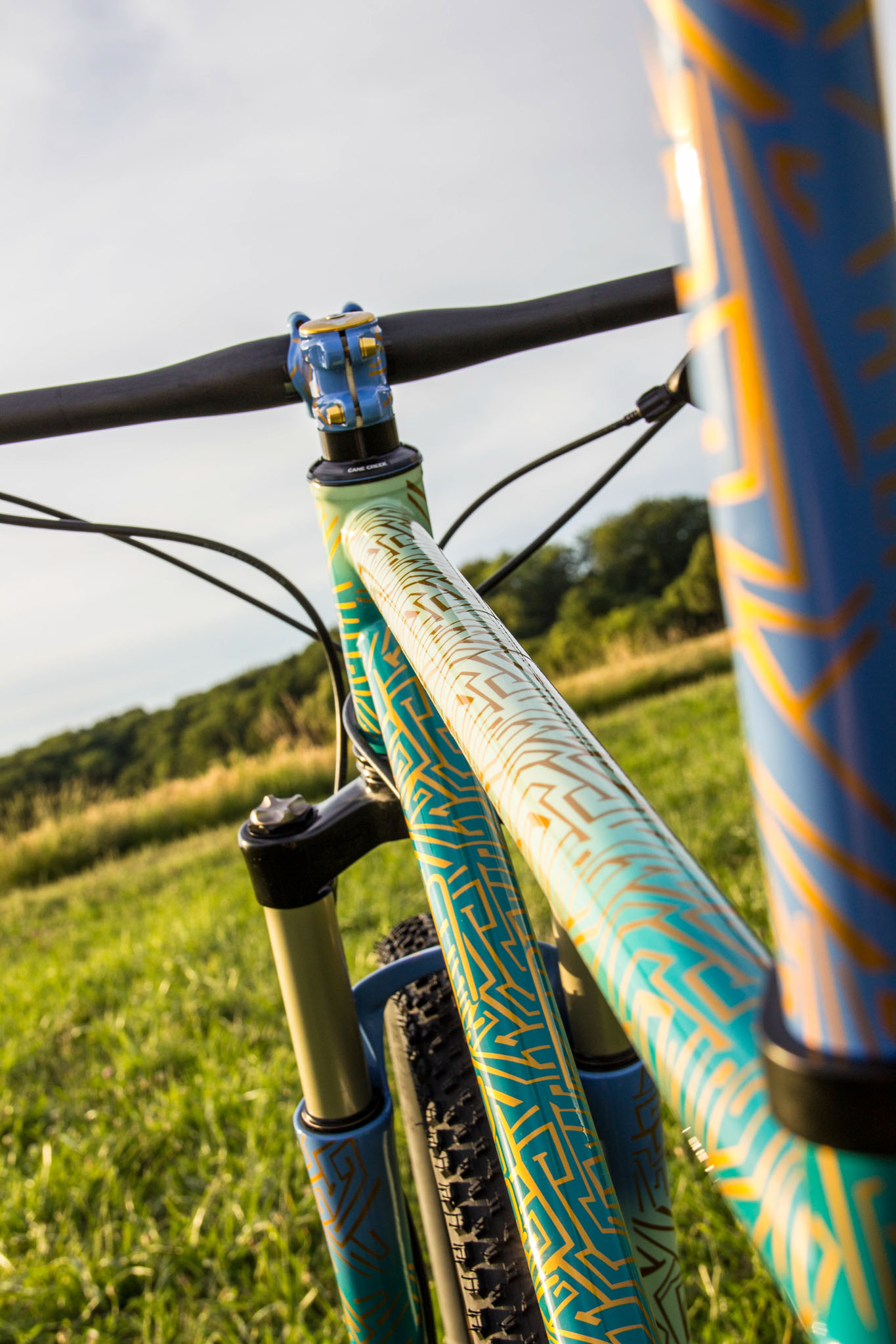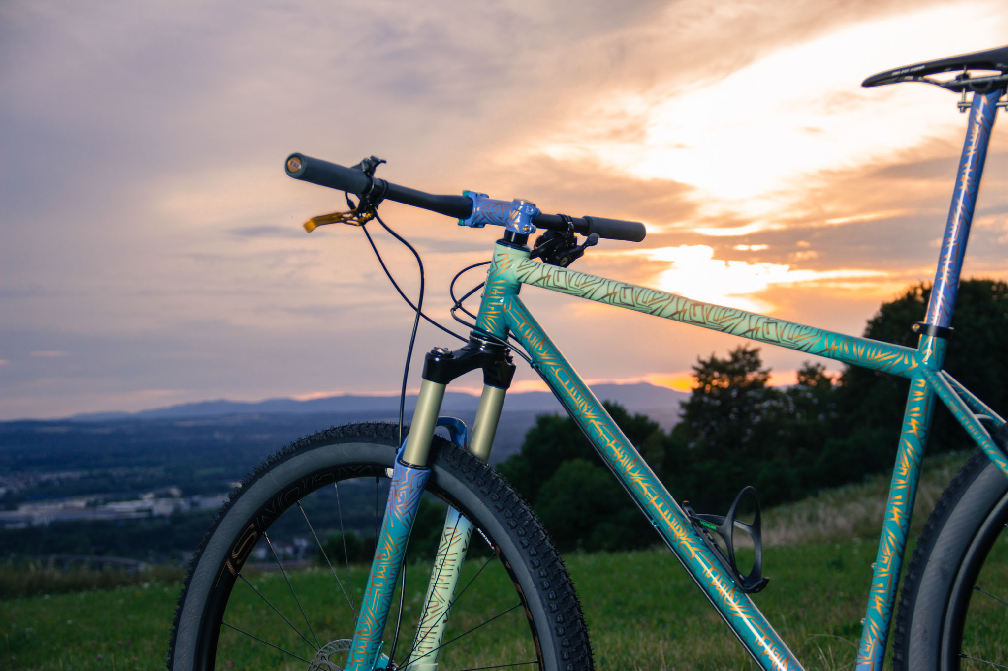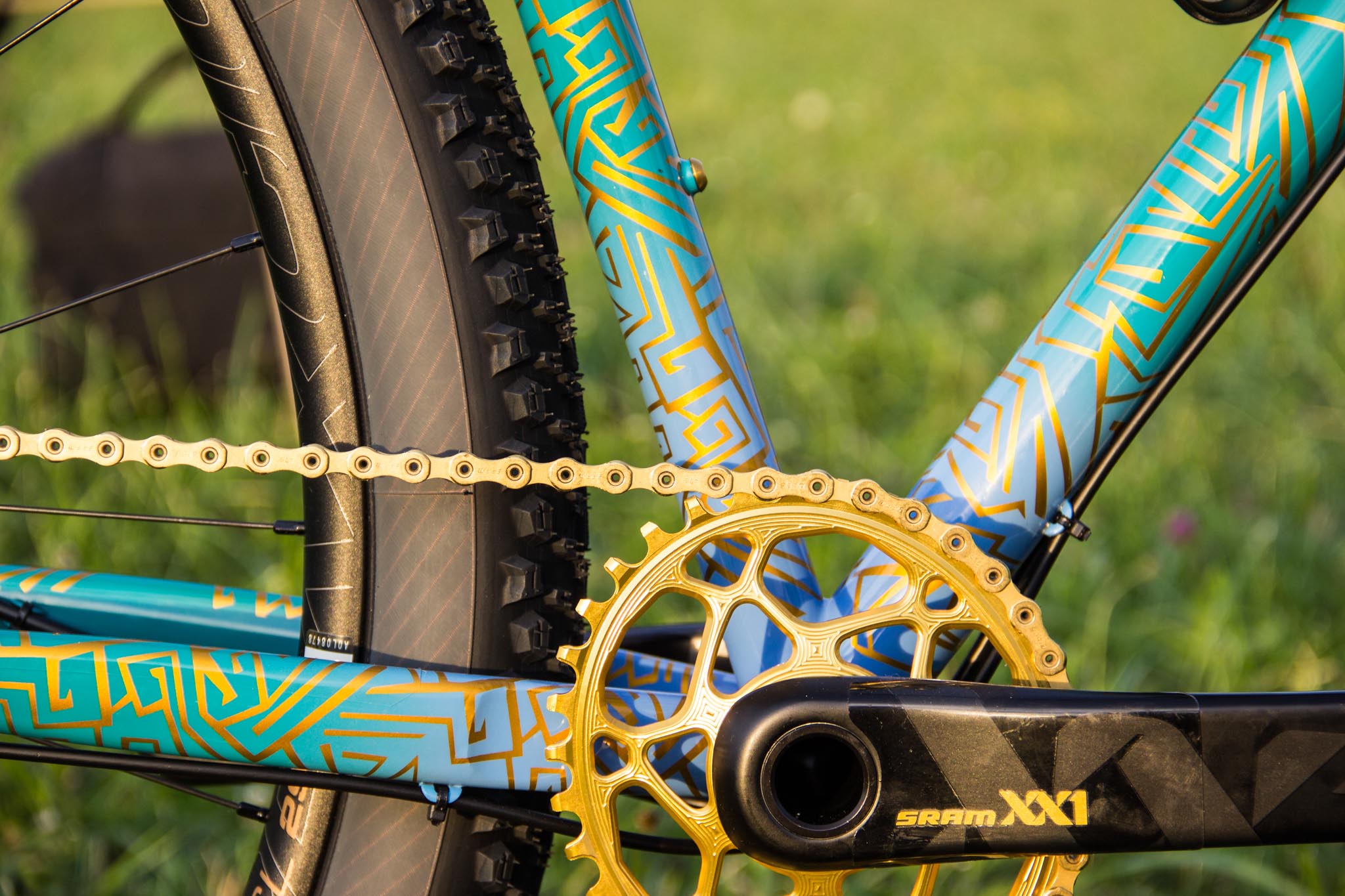 Celkový pohled na fascinující design SingleBe Aladdin 29er. Lakování zabralo bezmála 24 hodin, nicméně výsledek stojí opravdu za to. Kolo je osazenou sadou Sram Eagle s převodníkem Absoluteblack. Zapletená kola dodala Vittoria, nový PRO model Reaxcion SL a jednalo se o vůbec první pár dostupný v Německu. Další díly včetně brzd pochází od německé značky Trickstuff.