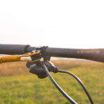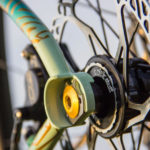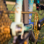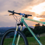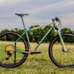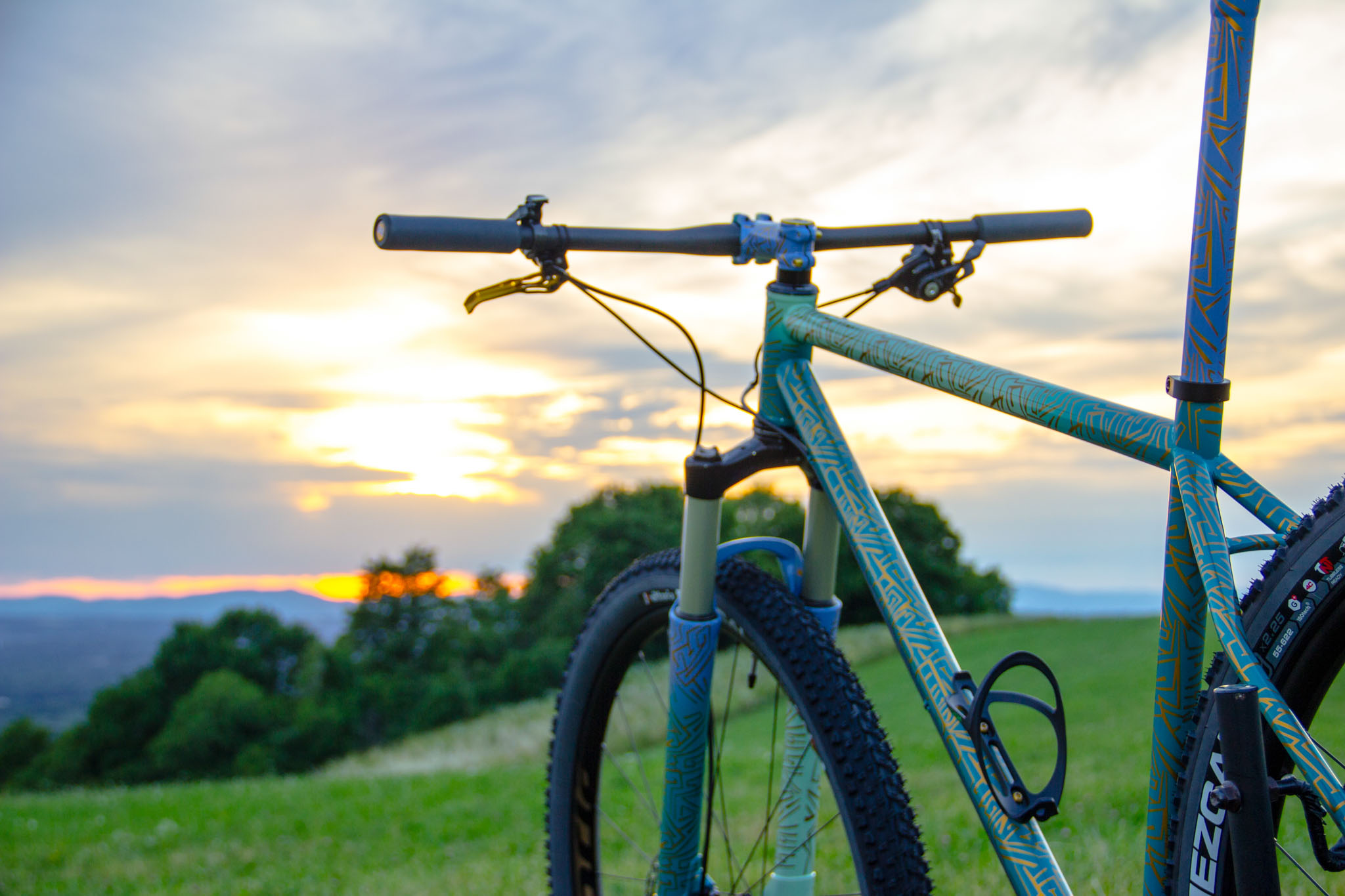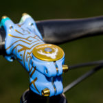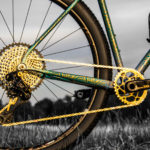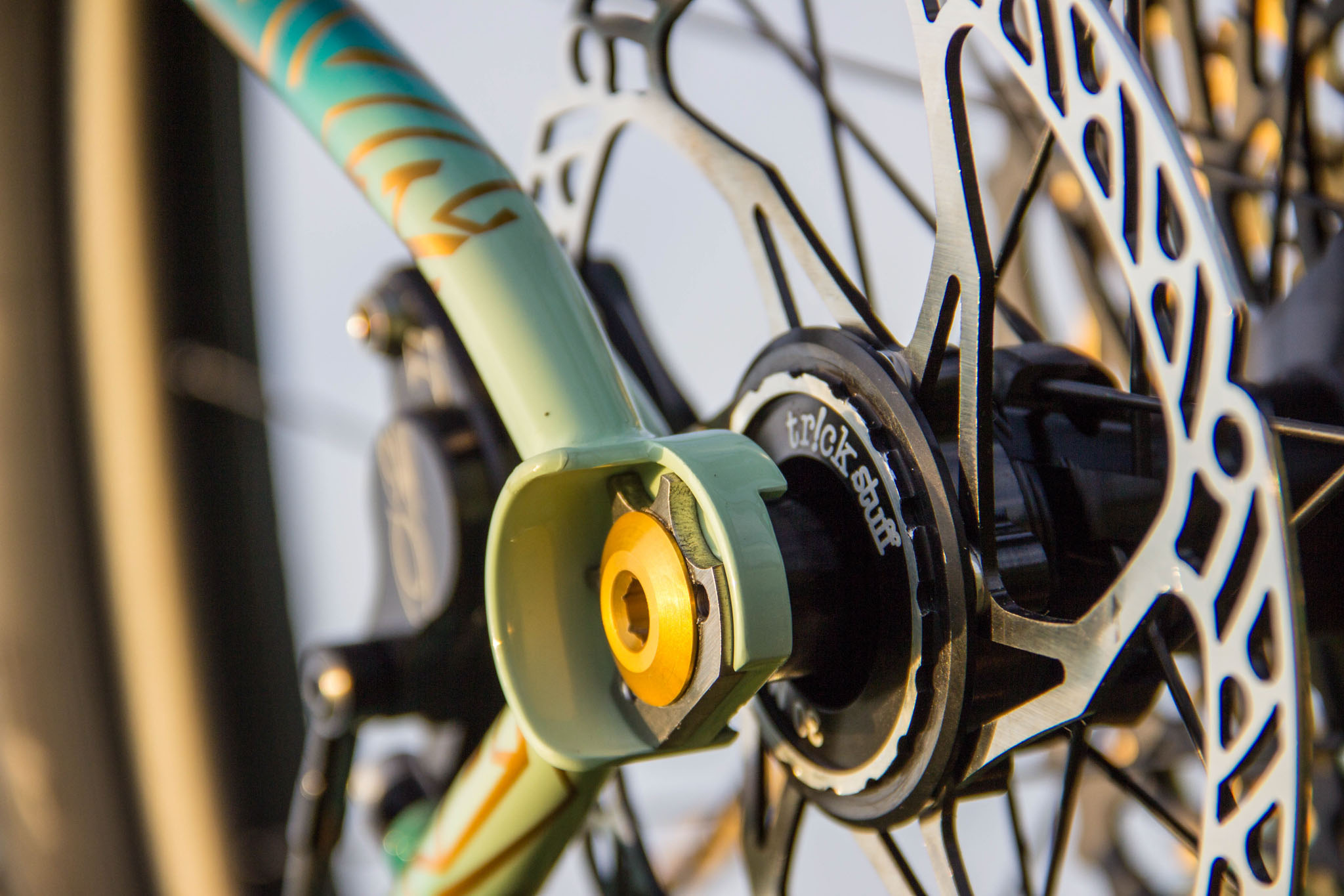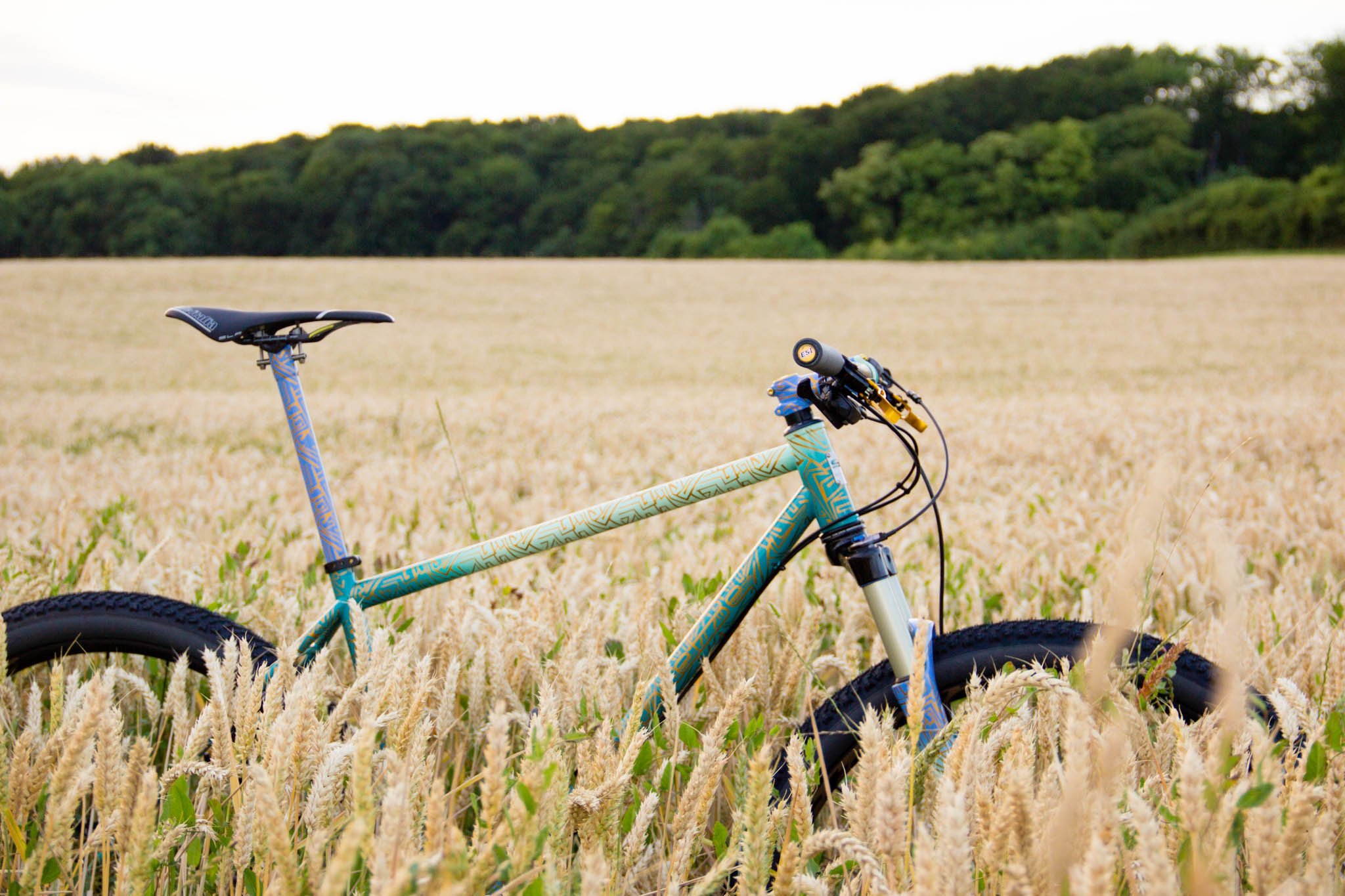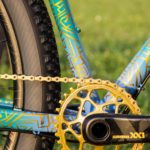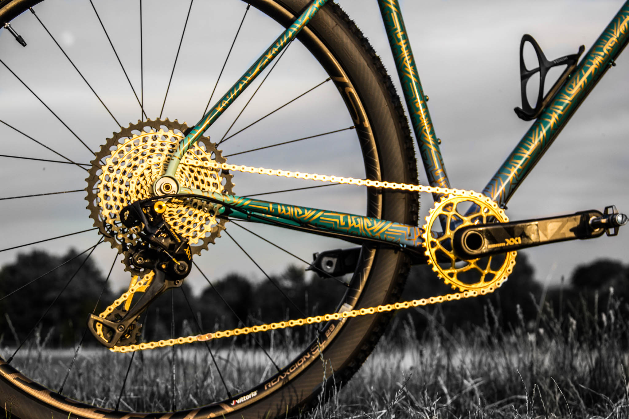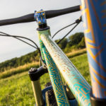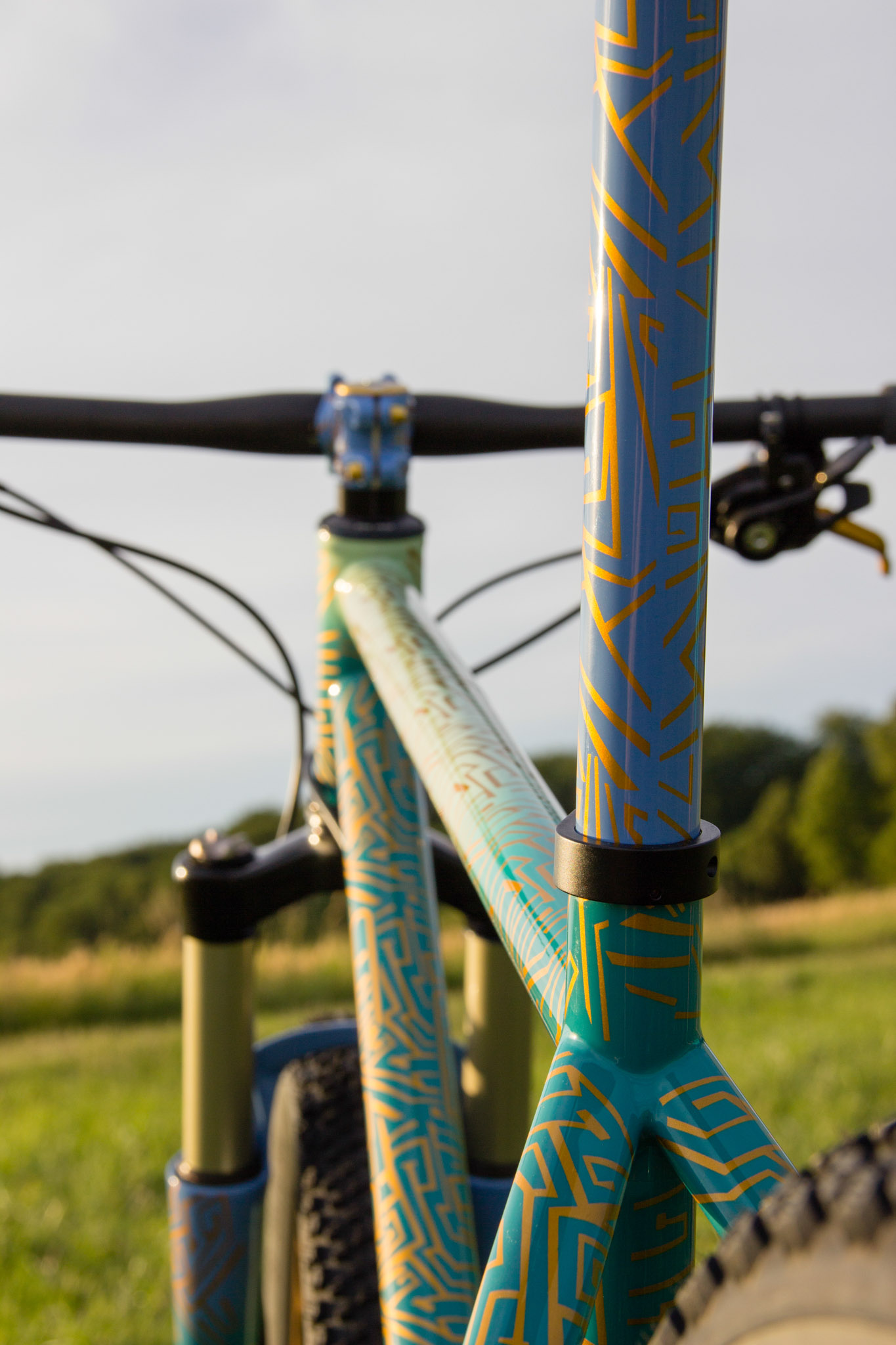 Celkový pohled na fascinující design SingleBe Aladdin 29er. Lakování zabralo bezmála 24 hodin, nicméně výsledek stojí opravdu za to. Kolo je osazenou sadou Sram Eagle s převodníkem Absoluteblack. Zapletená kola dodala Vittoria, nový PRO model Reaxcion SL a jednalo se o vůbec první pár dostupný v Německu. Další díly včetně brzd pochází od německé značky Trickstuff.
