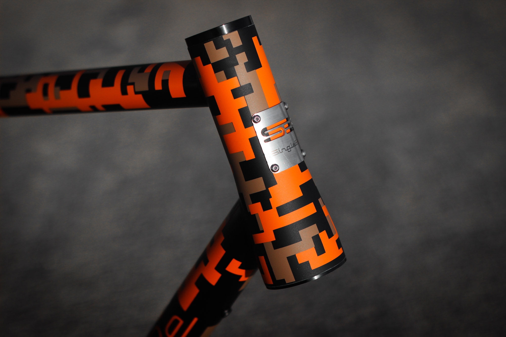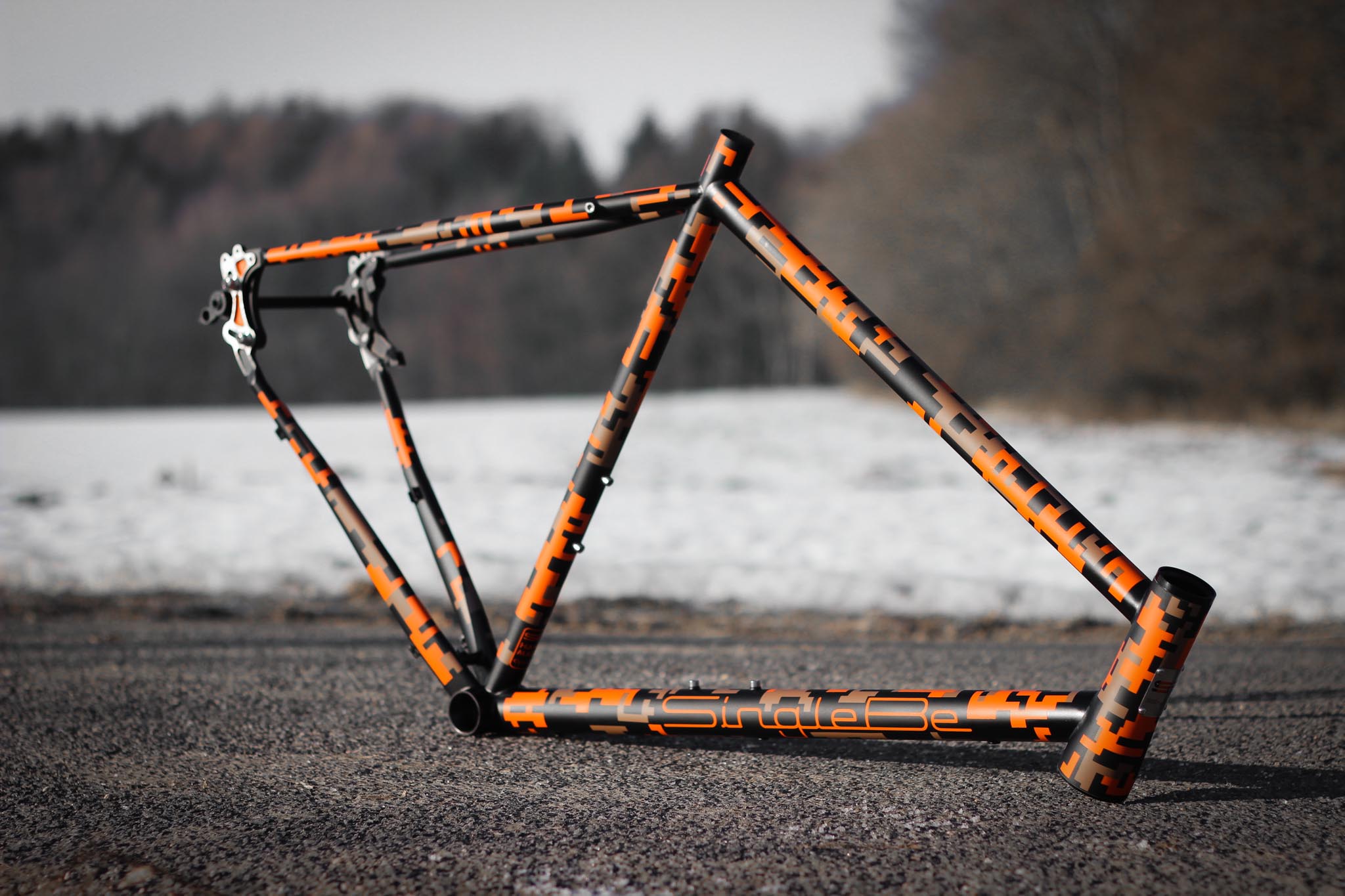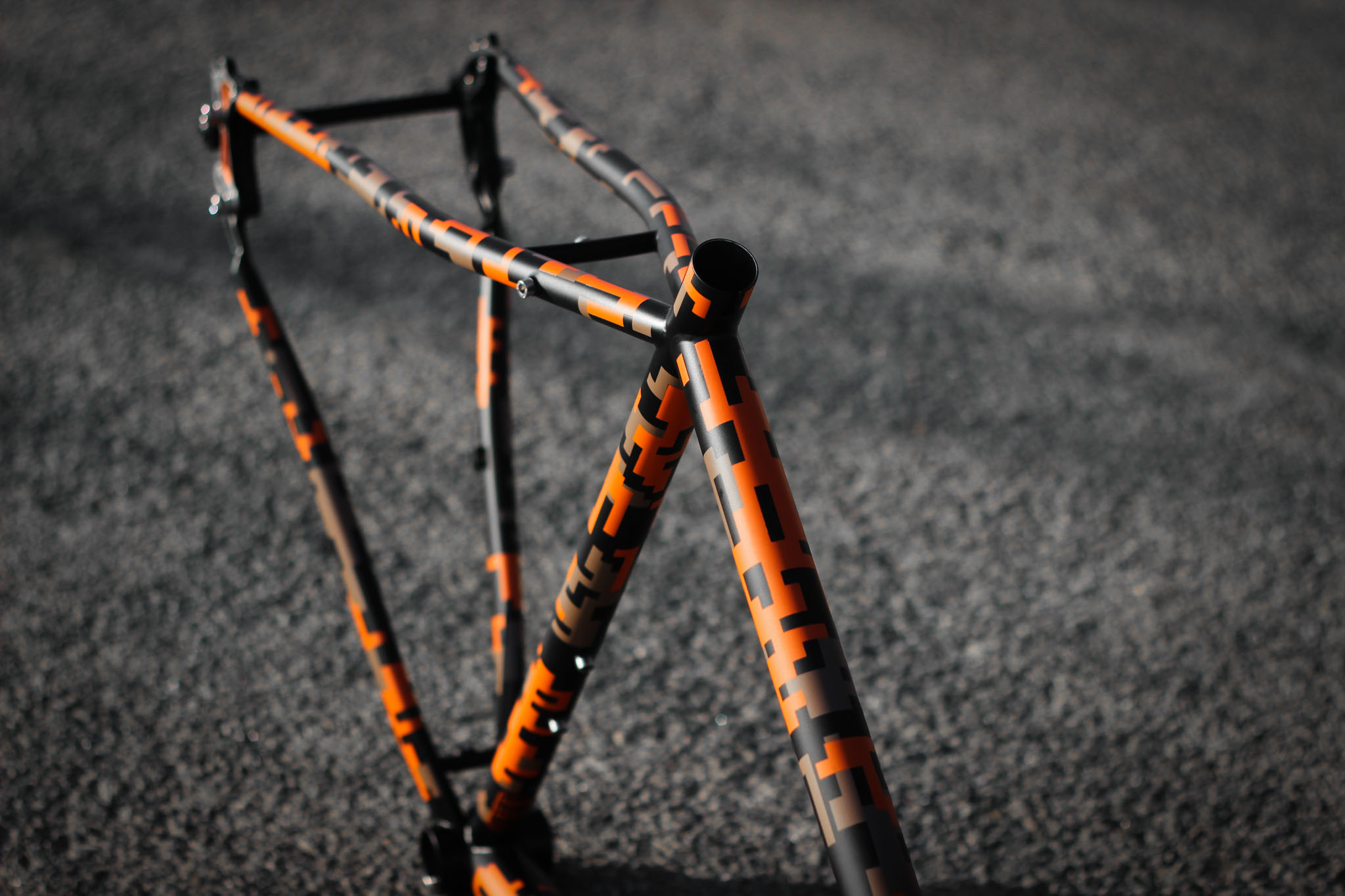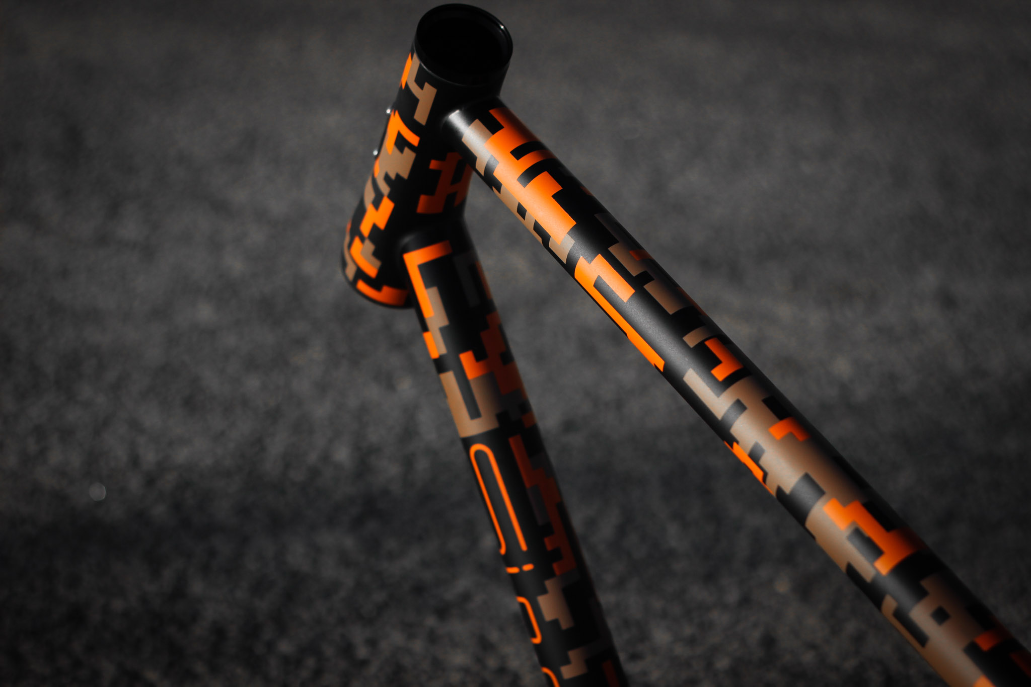 Hlavní rámové trubky Reynolds 853, zadní stavba a tapered hlavová trubka Dedacciai. Komplet včetně ocelové vidlice provedené v digitálním camo designu.