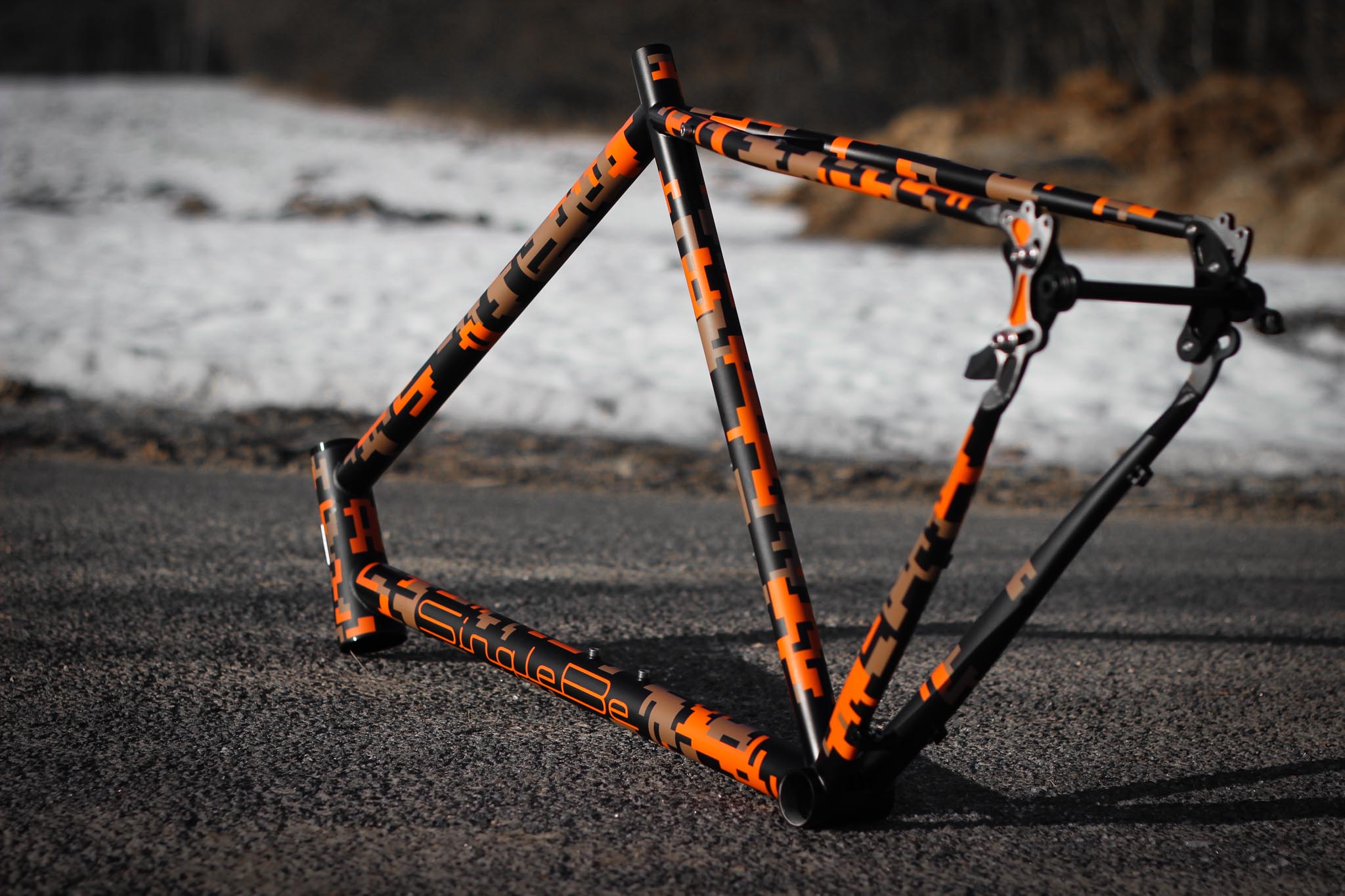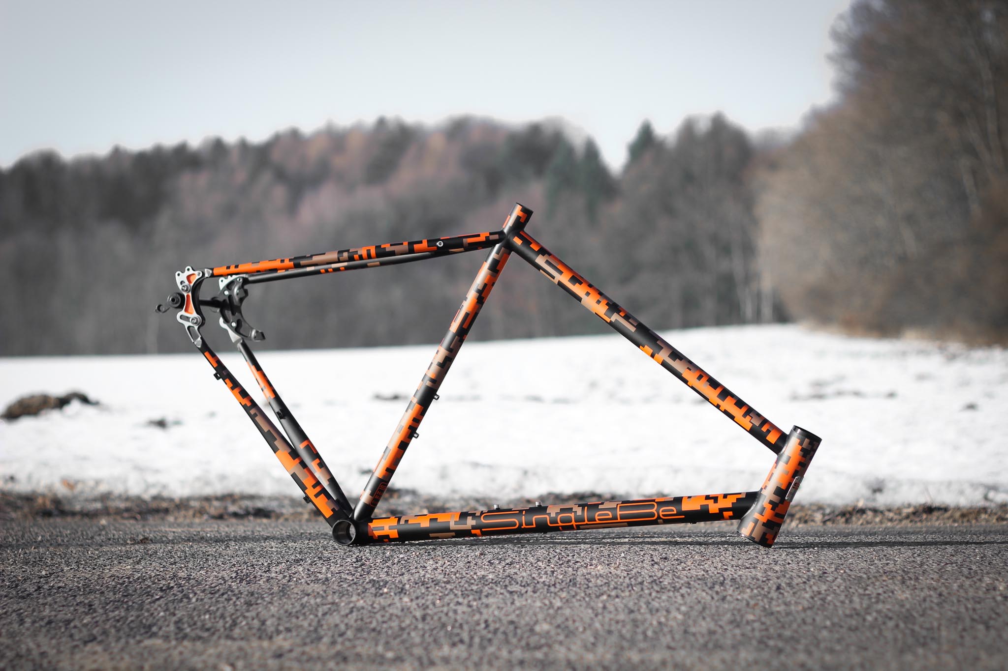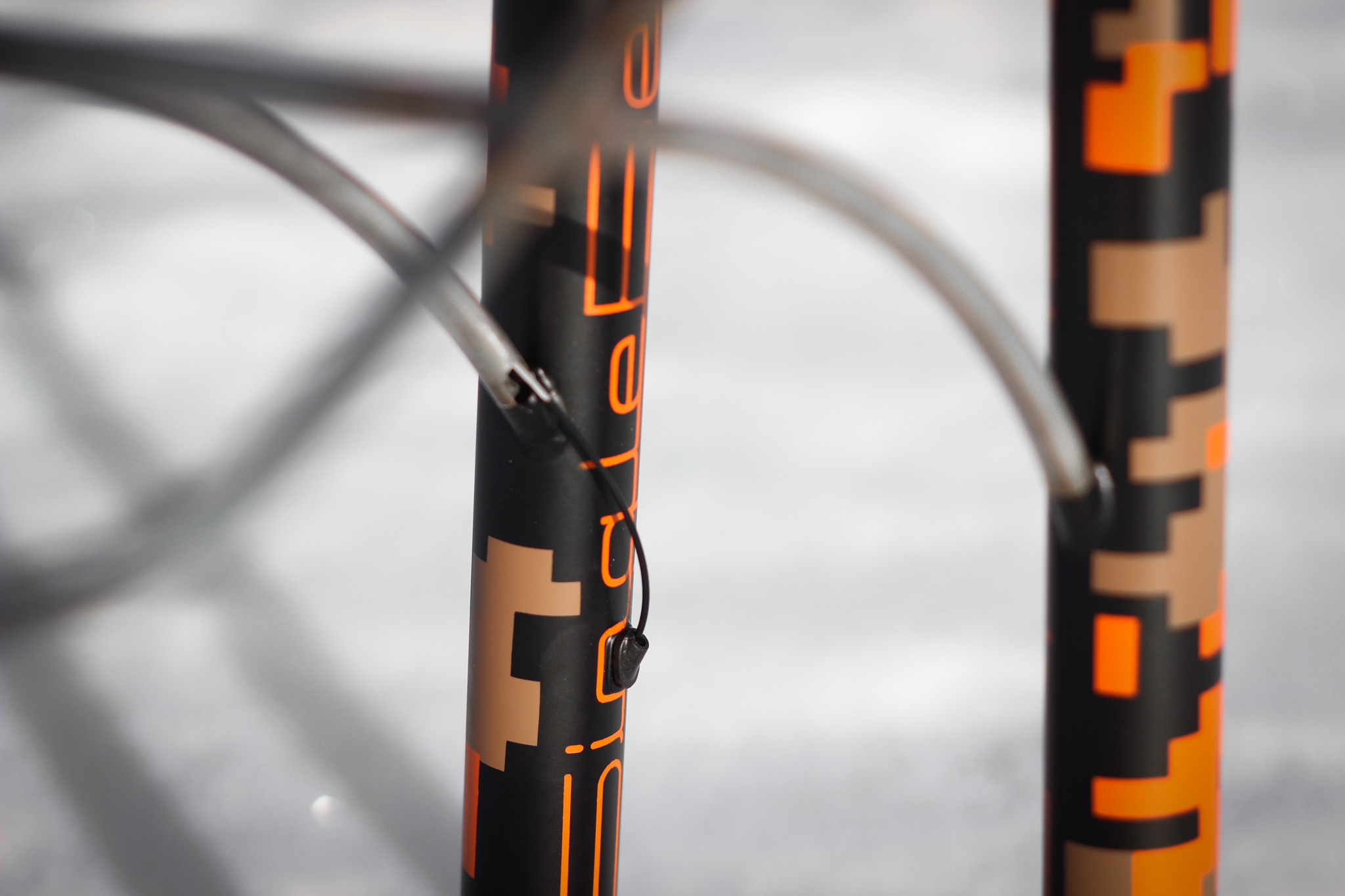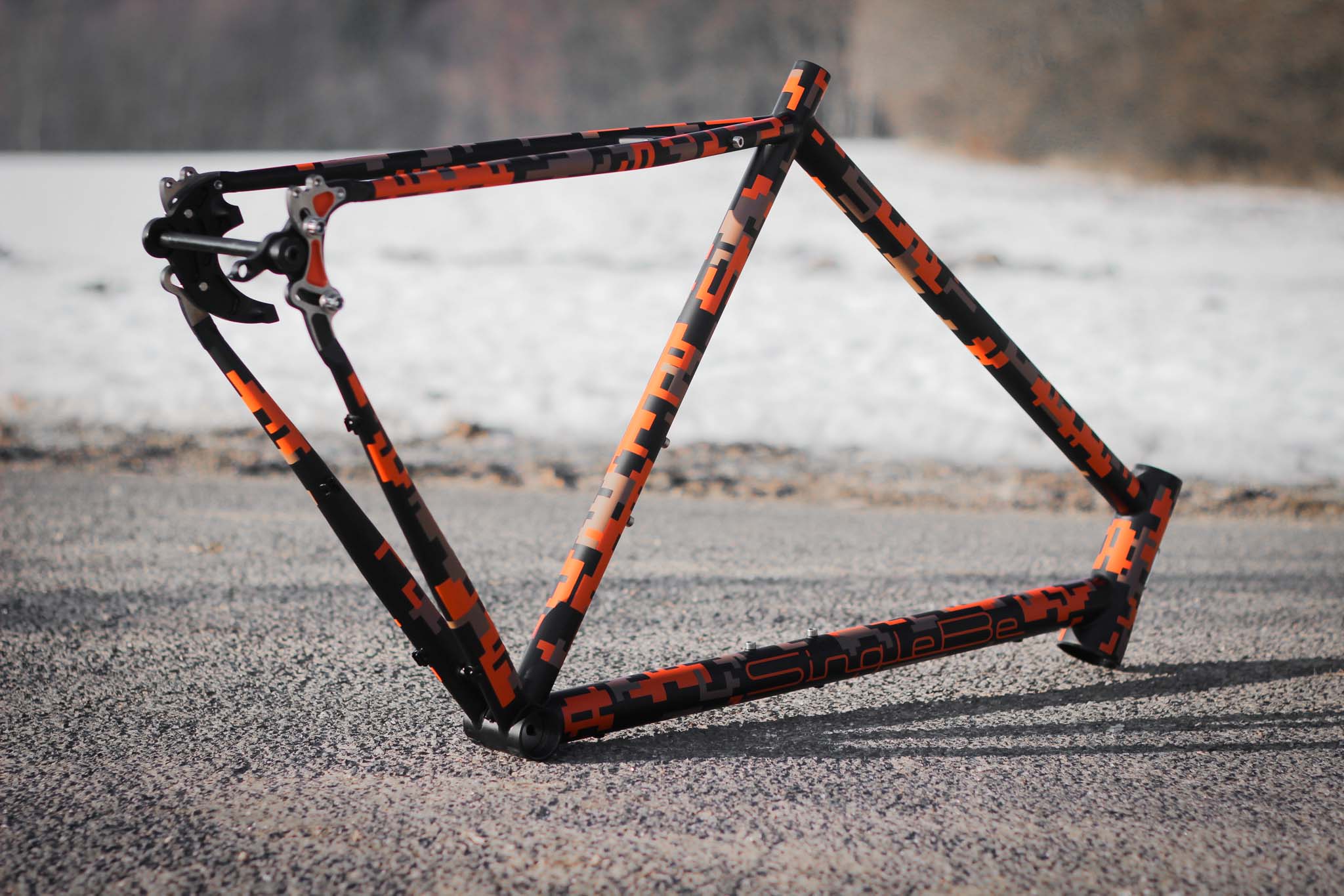Hlavní rámové trubky Reynolds 853, zadní stavba a tapered hlavová trubka Dedacciai. Komplet včetně ocelové vidlice provedené v digitálním camo designu.