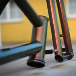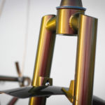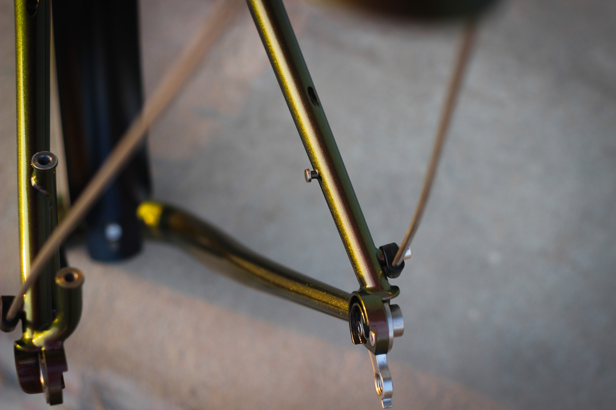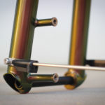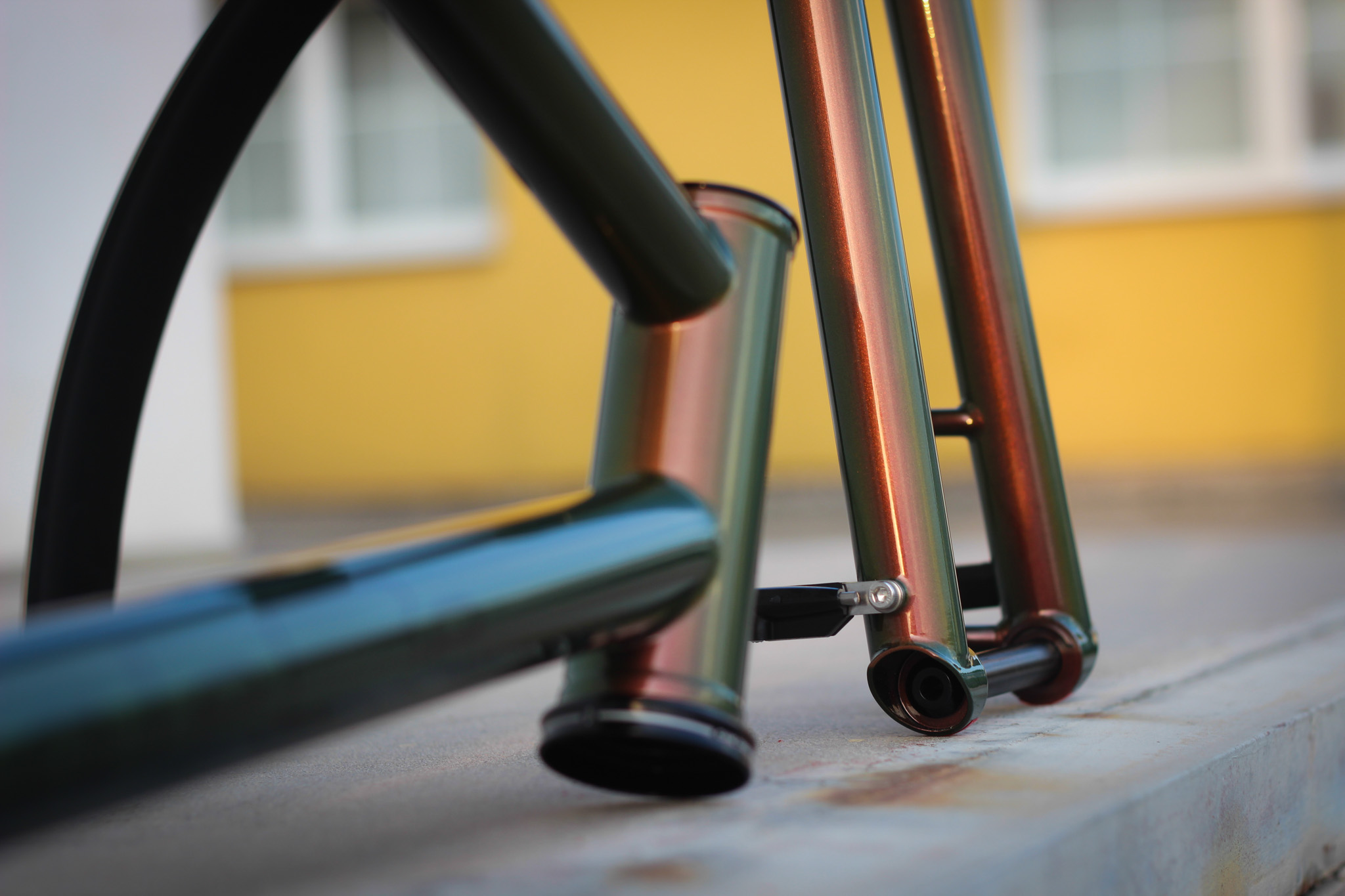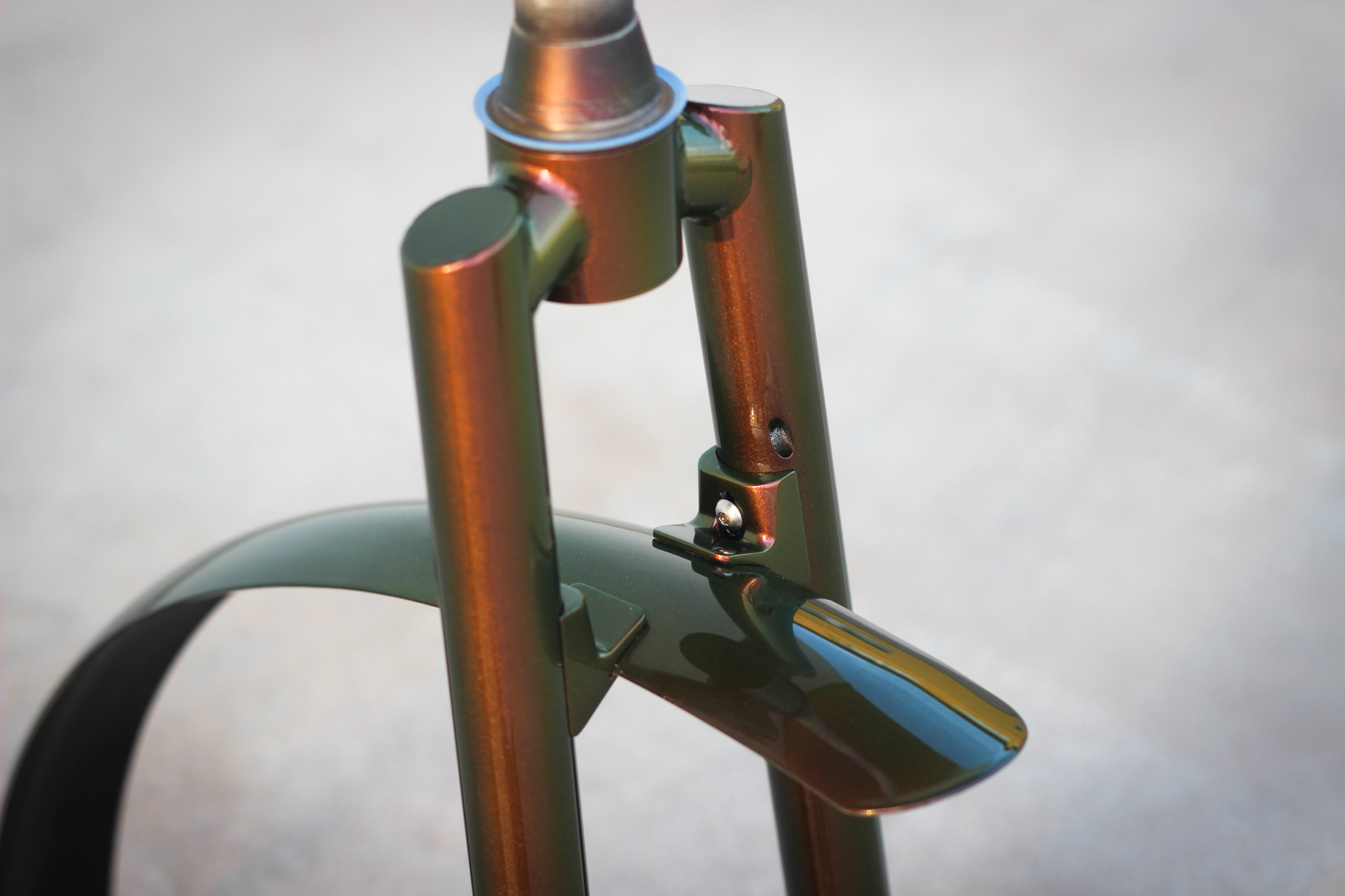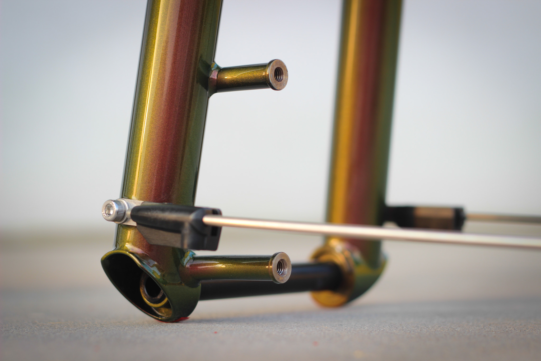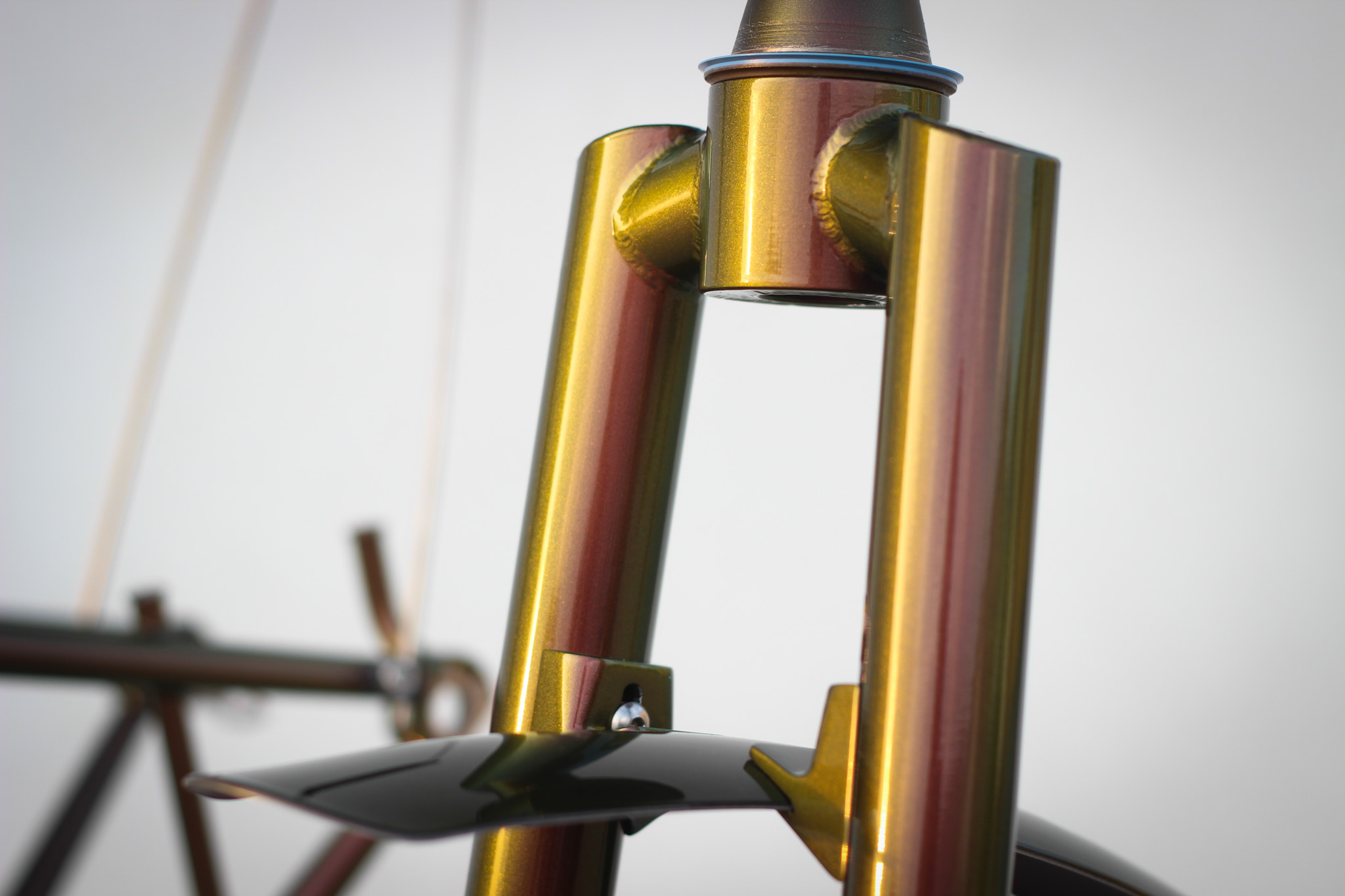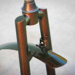Uchycení brzdy je také nerezové a tak mohou být styčné plochy s třmenem brzdy zbaveny veškeré barvy. Nerezové jsou i vložky patek a nedochází tak tedy k vymačkání laku.