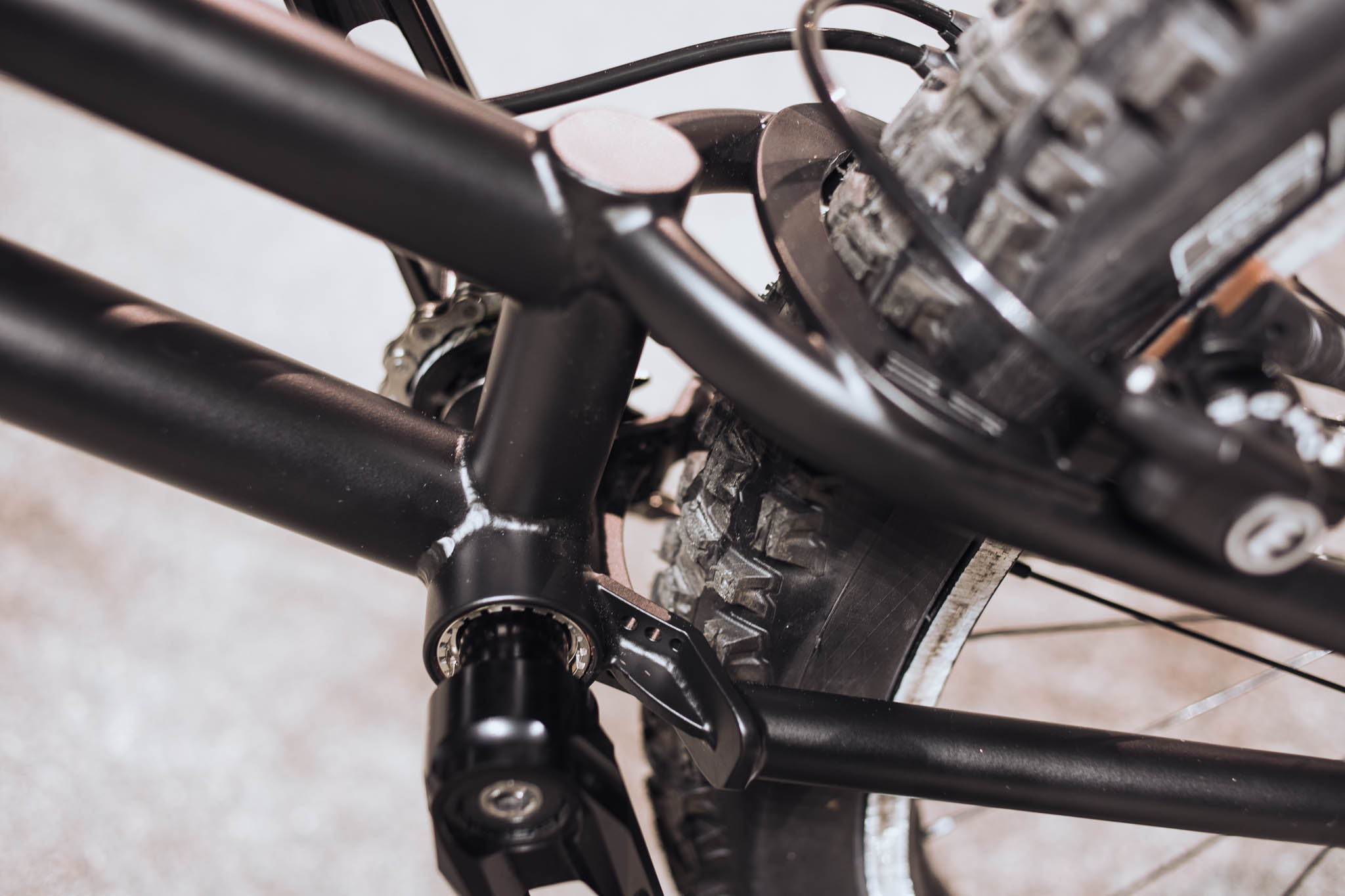 Dopínání zadního kola je zajištěno vnějším excentrickým dopínacím šnečkem vně zadní pravé patky.