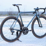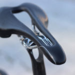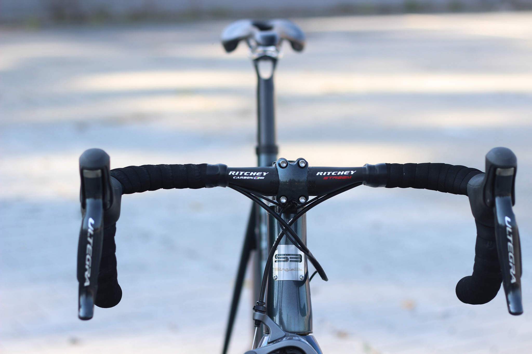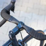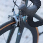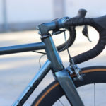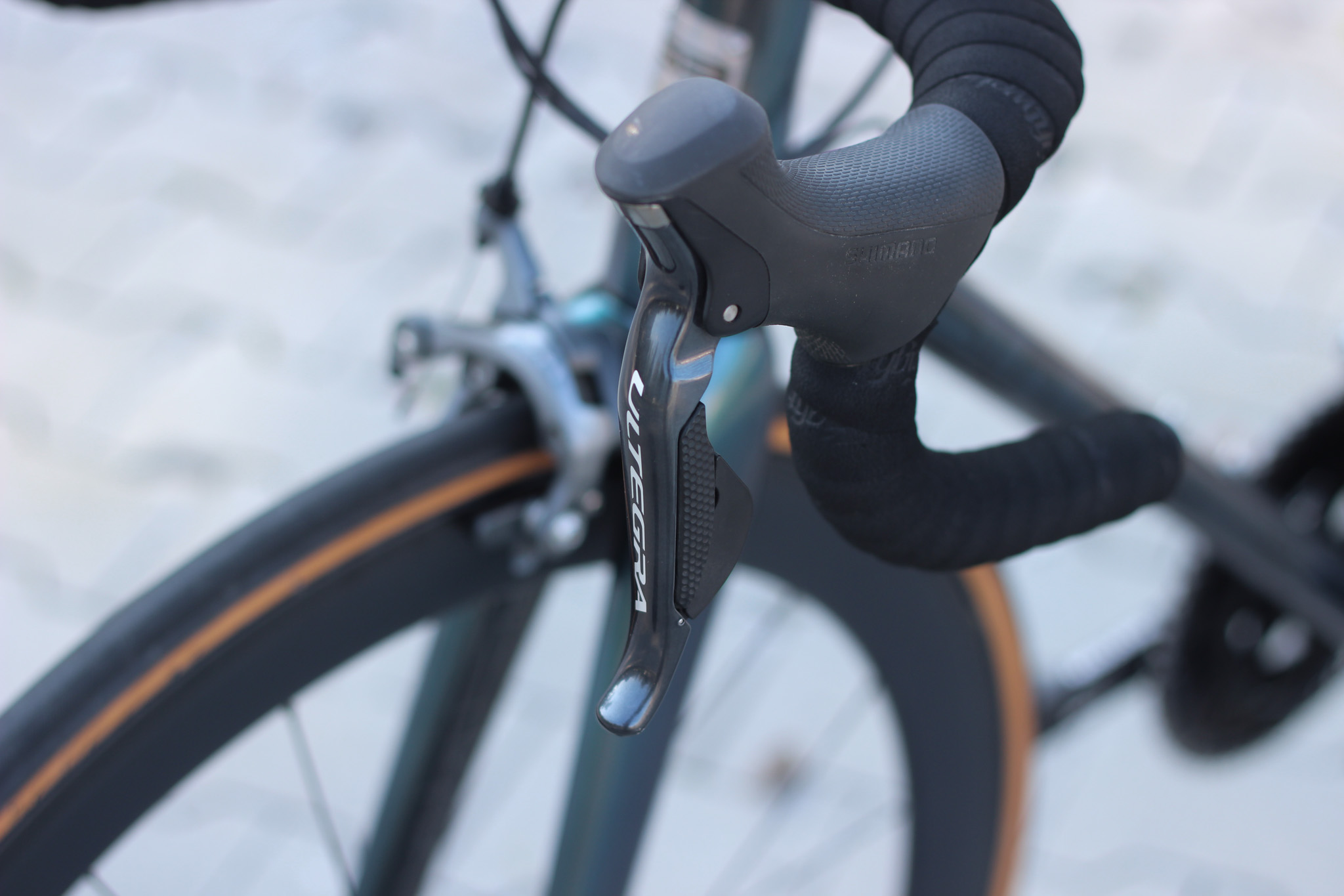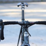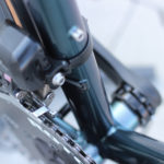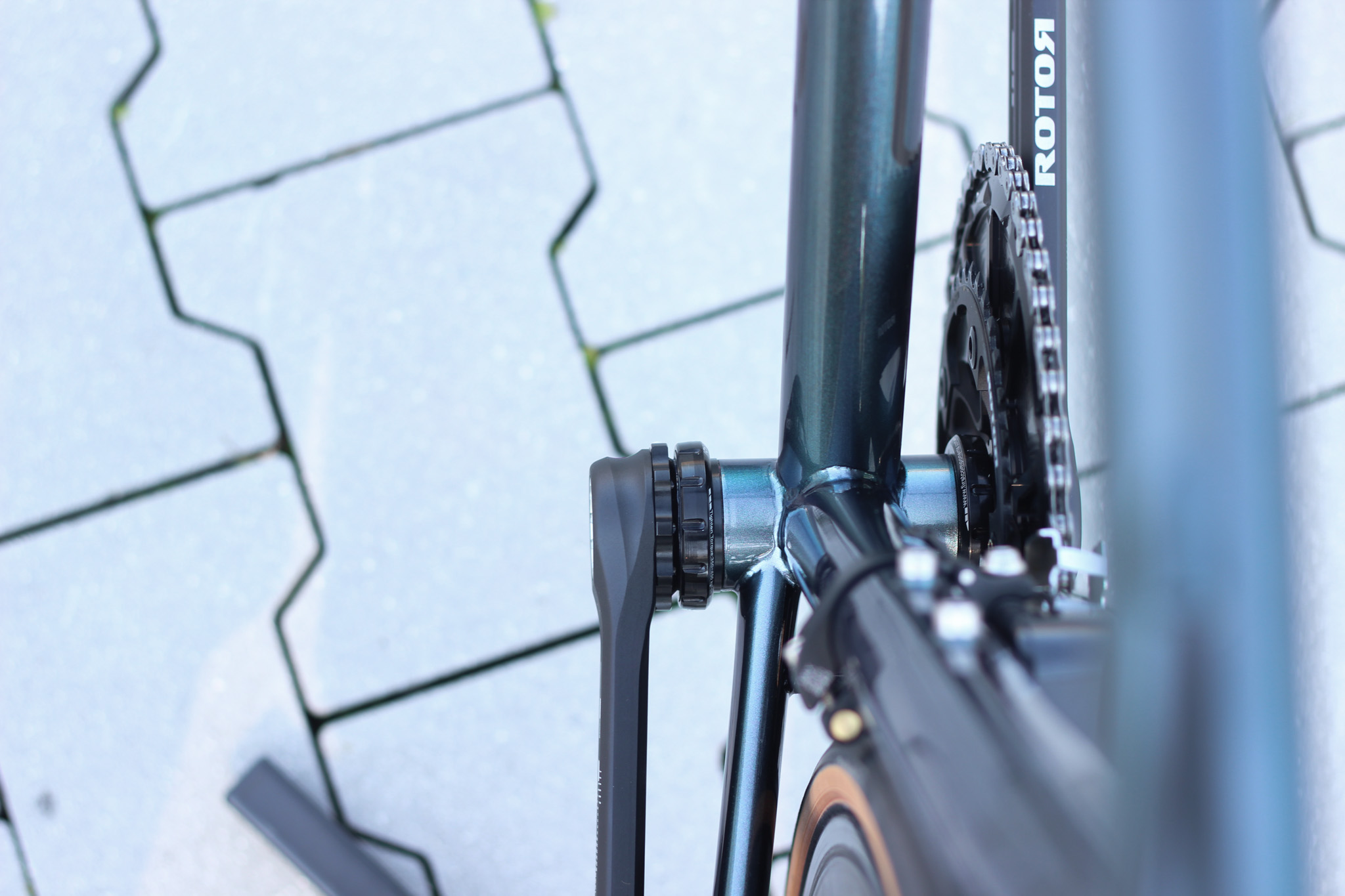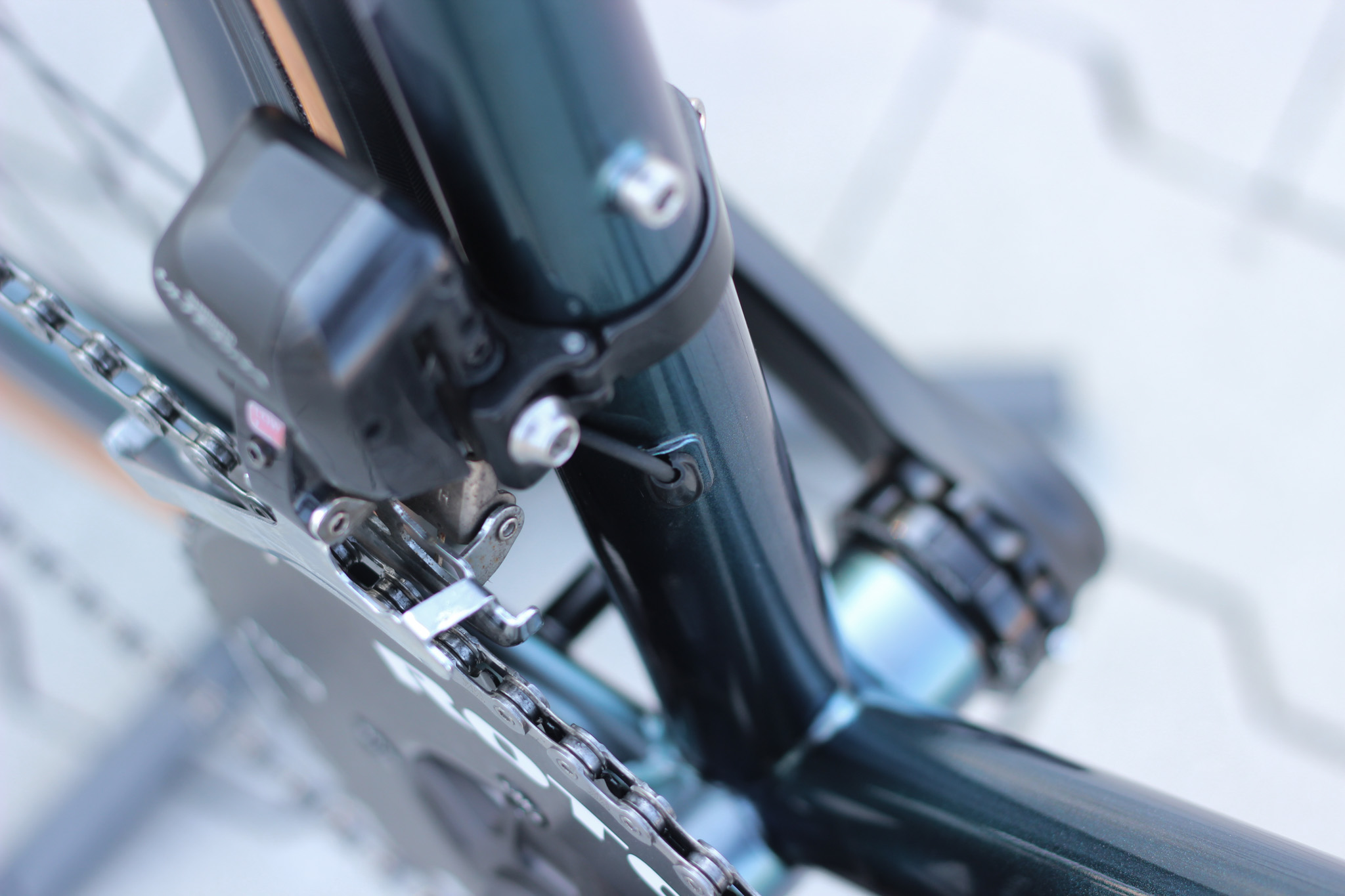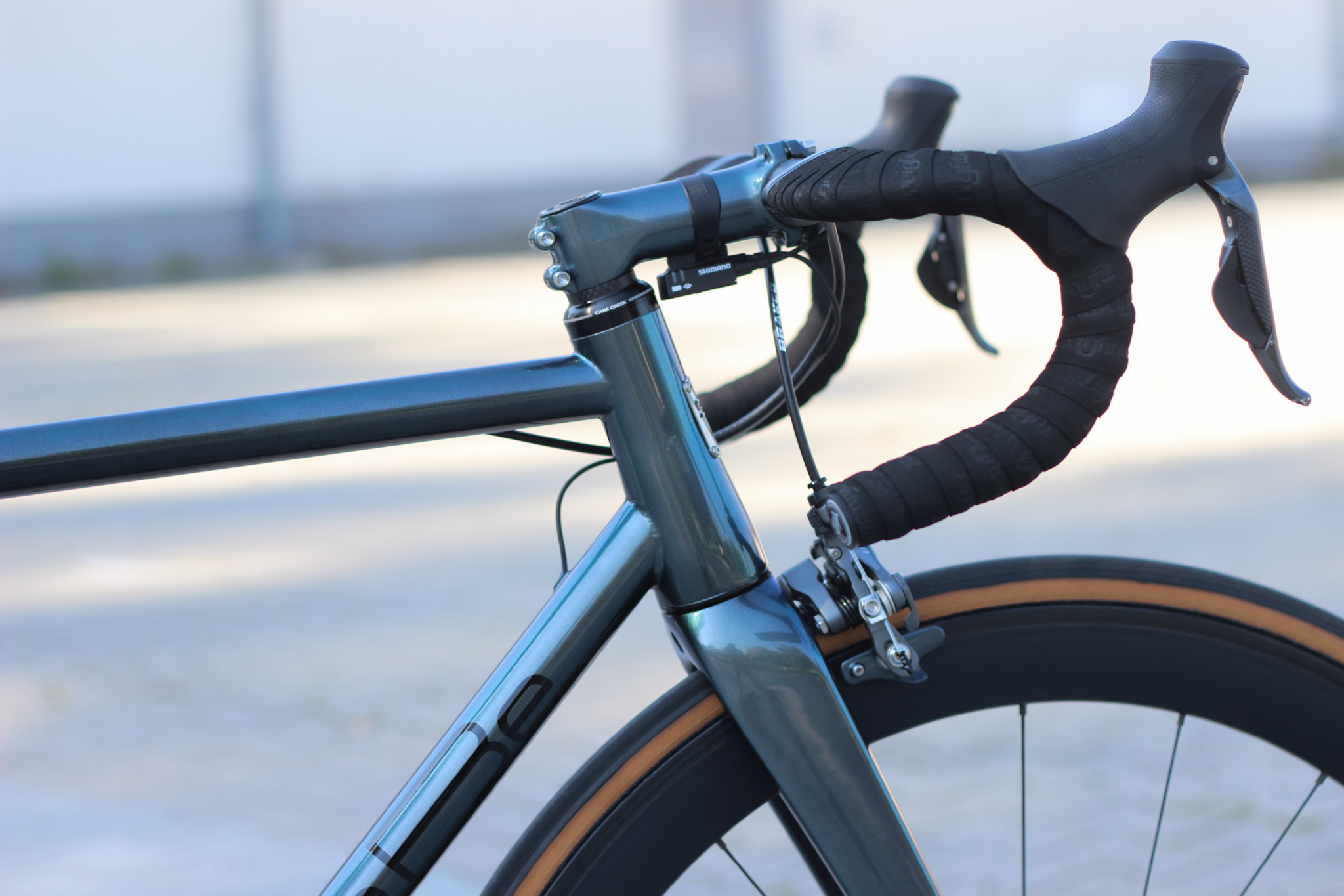 Shimano Di2 control unit je umístěný pod představcem, který je lakován v titanové chameleon barvě rámu.