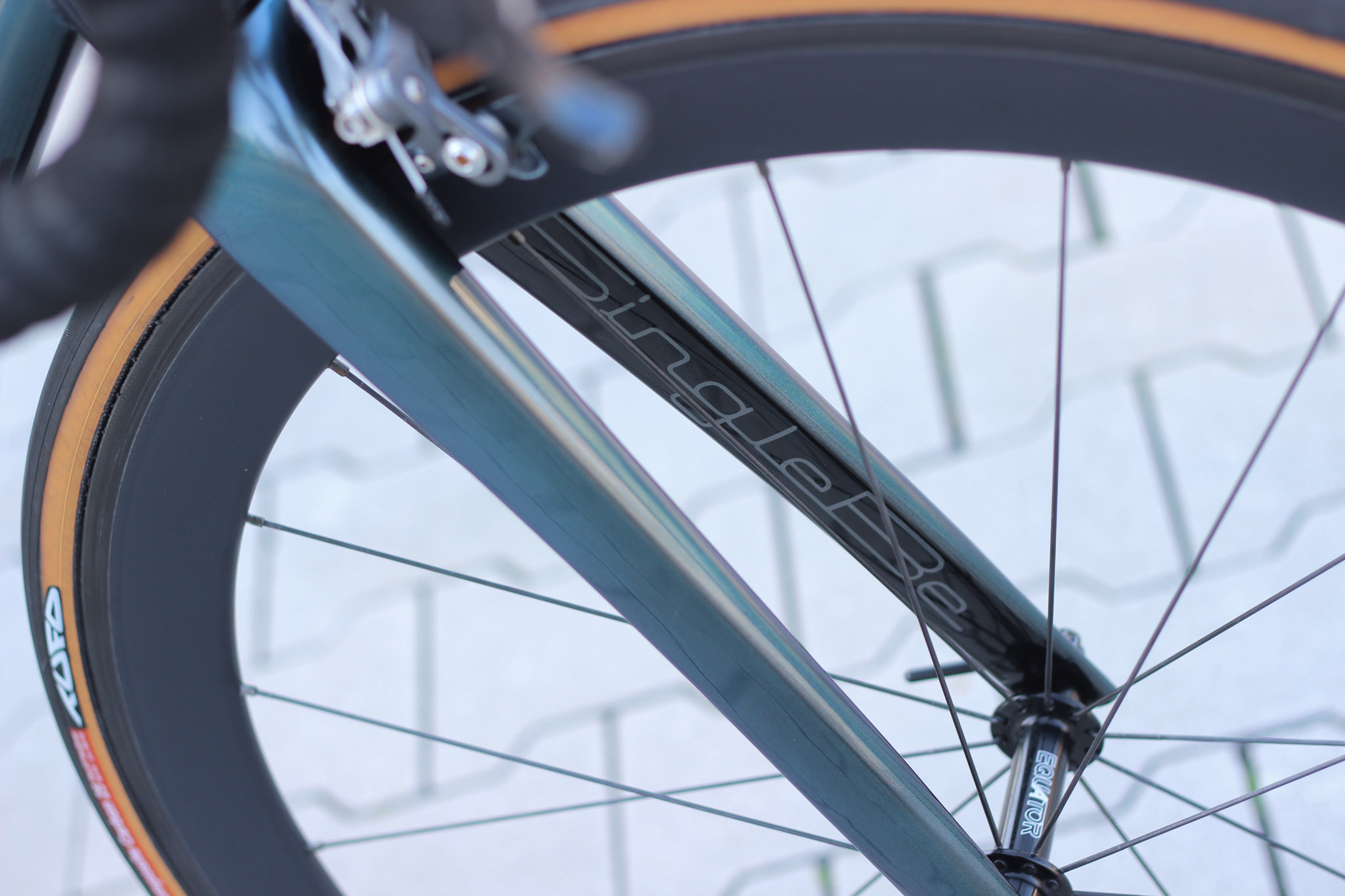 Lakovaná je i silniční vidlice Trigon s vnitřním nápisem SingleBe.