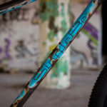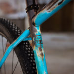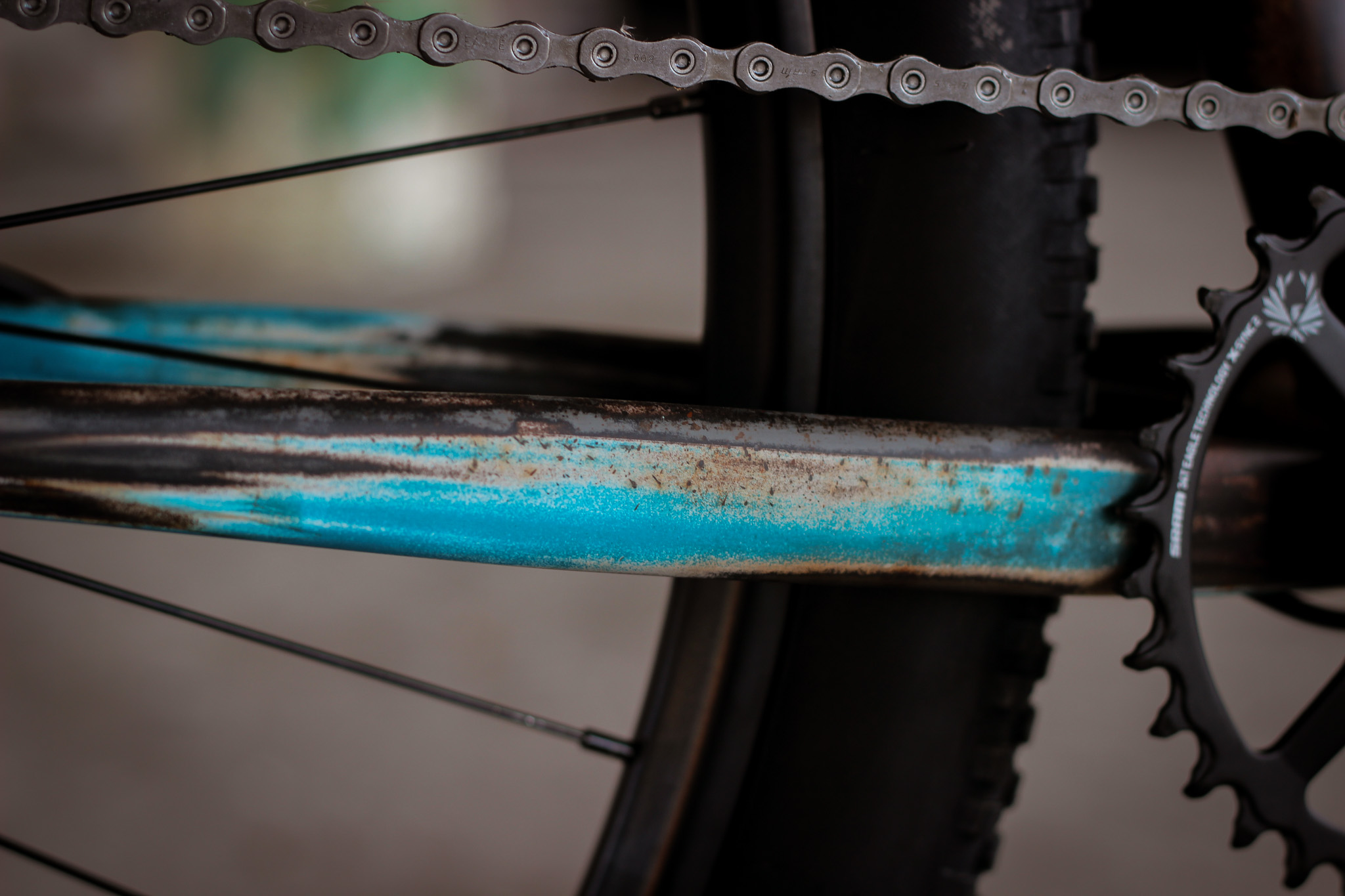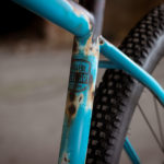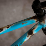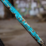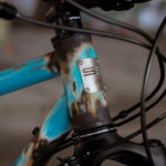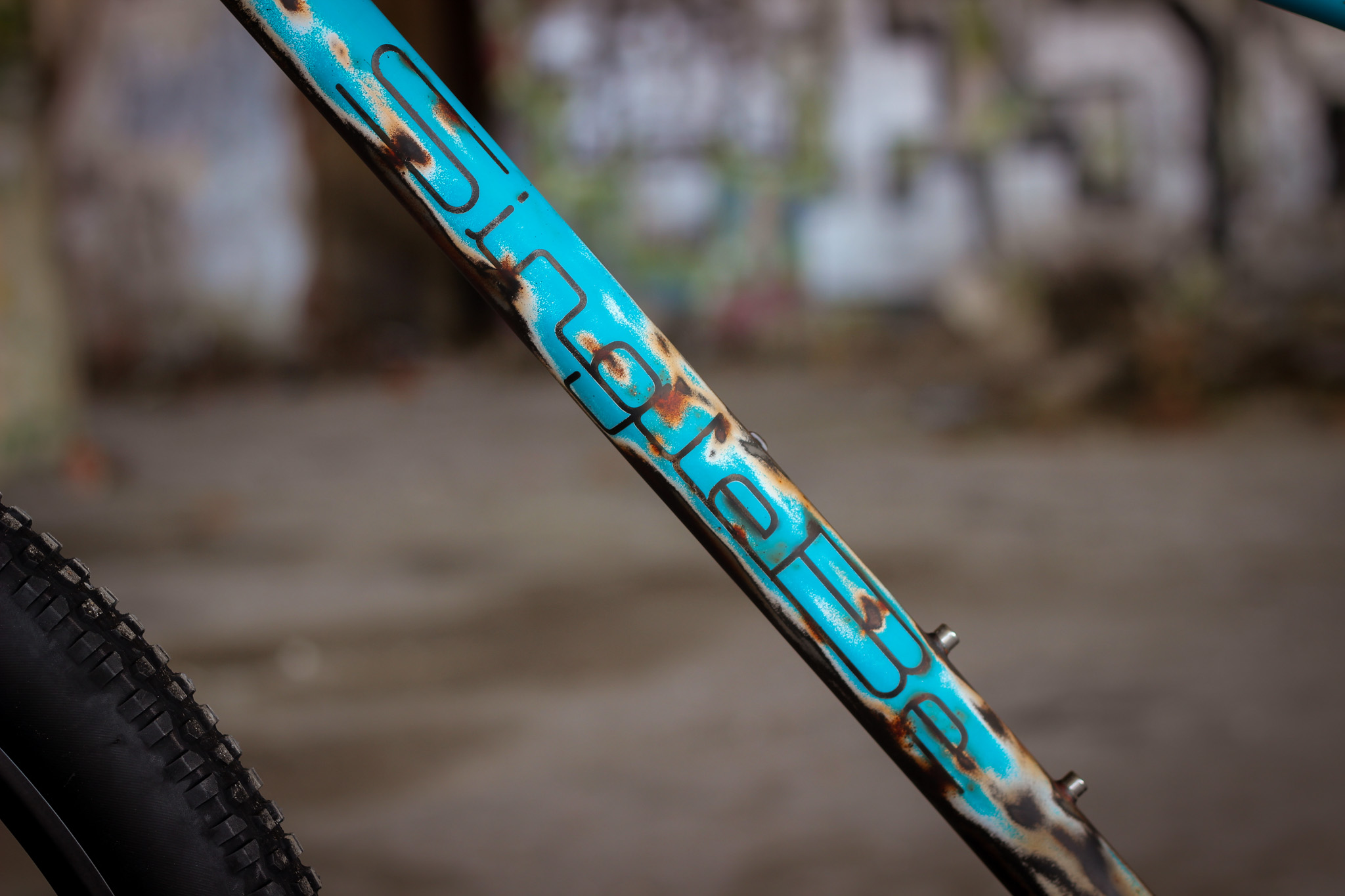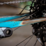 Nápis na hlavní spodní rámové trubce tohoto ocelového rámu z Reynold 853 je také pěkně oprýskaný.