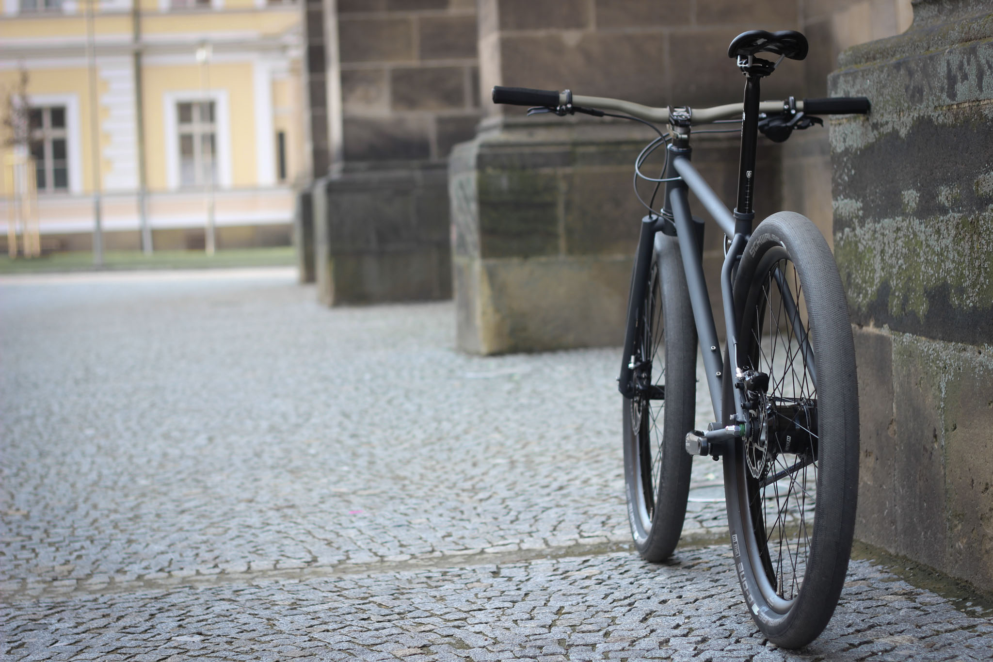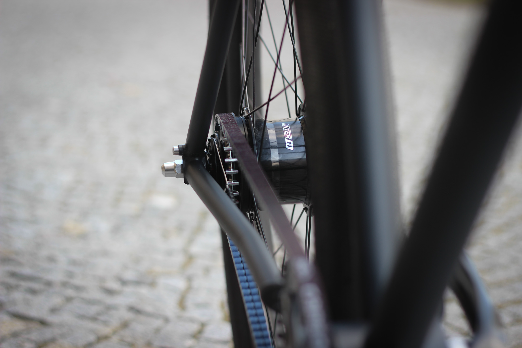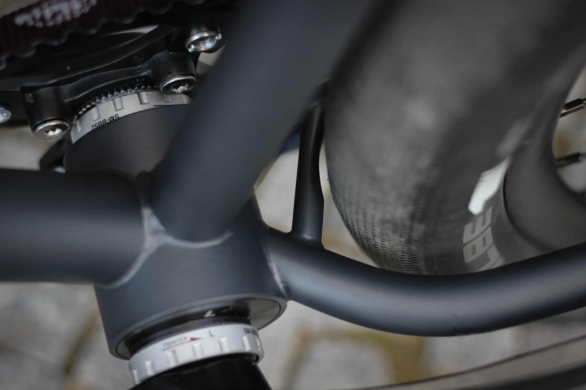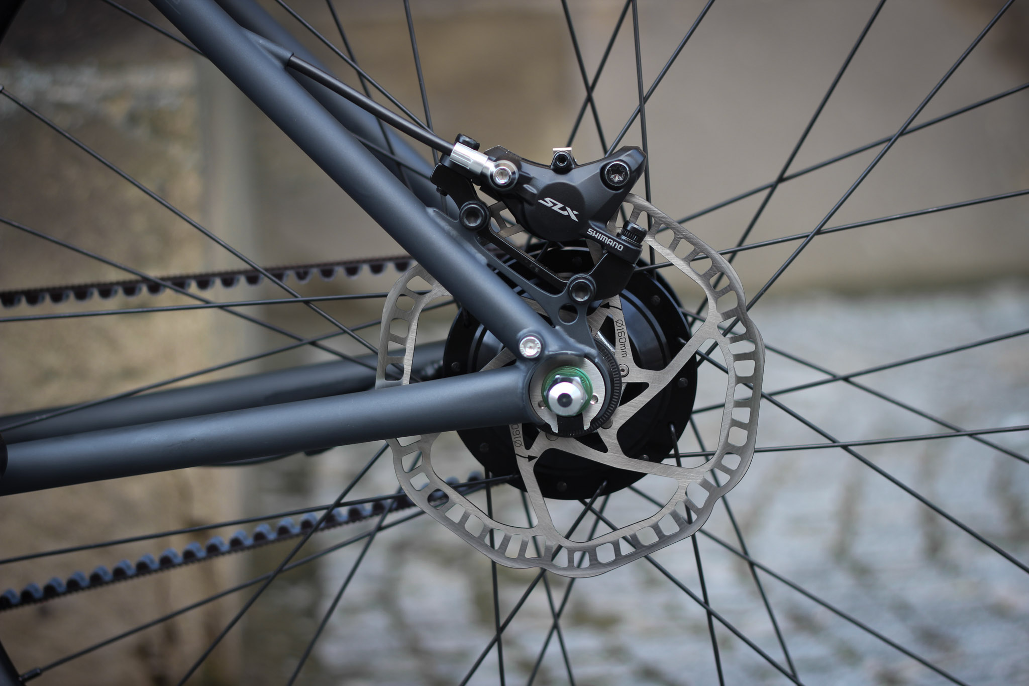 Alfine 11ti rychlostní zadní náboj a pohon řemenem Gates Carbon Drive. Tiché řešení vyžadující minimum údržby.