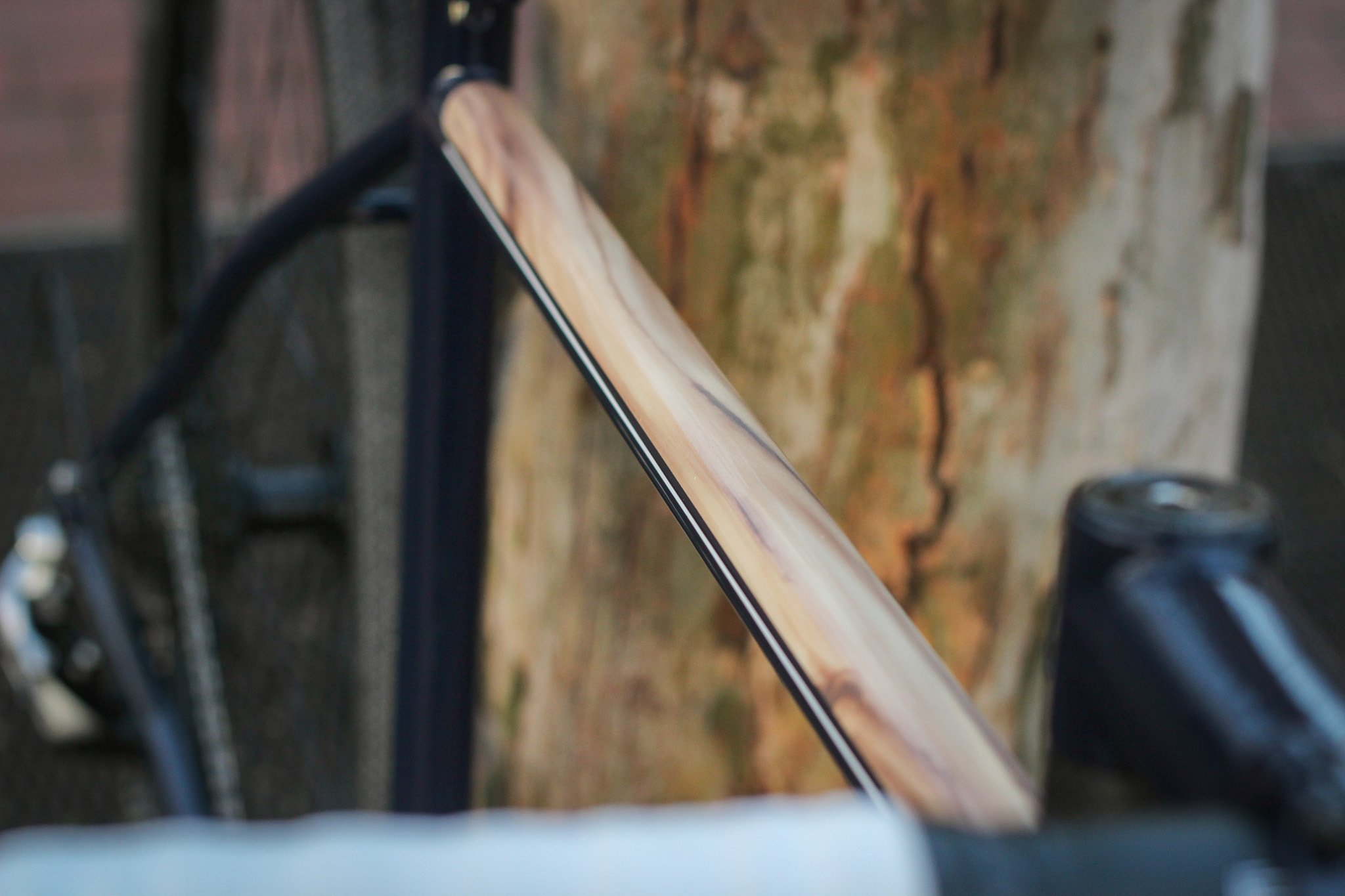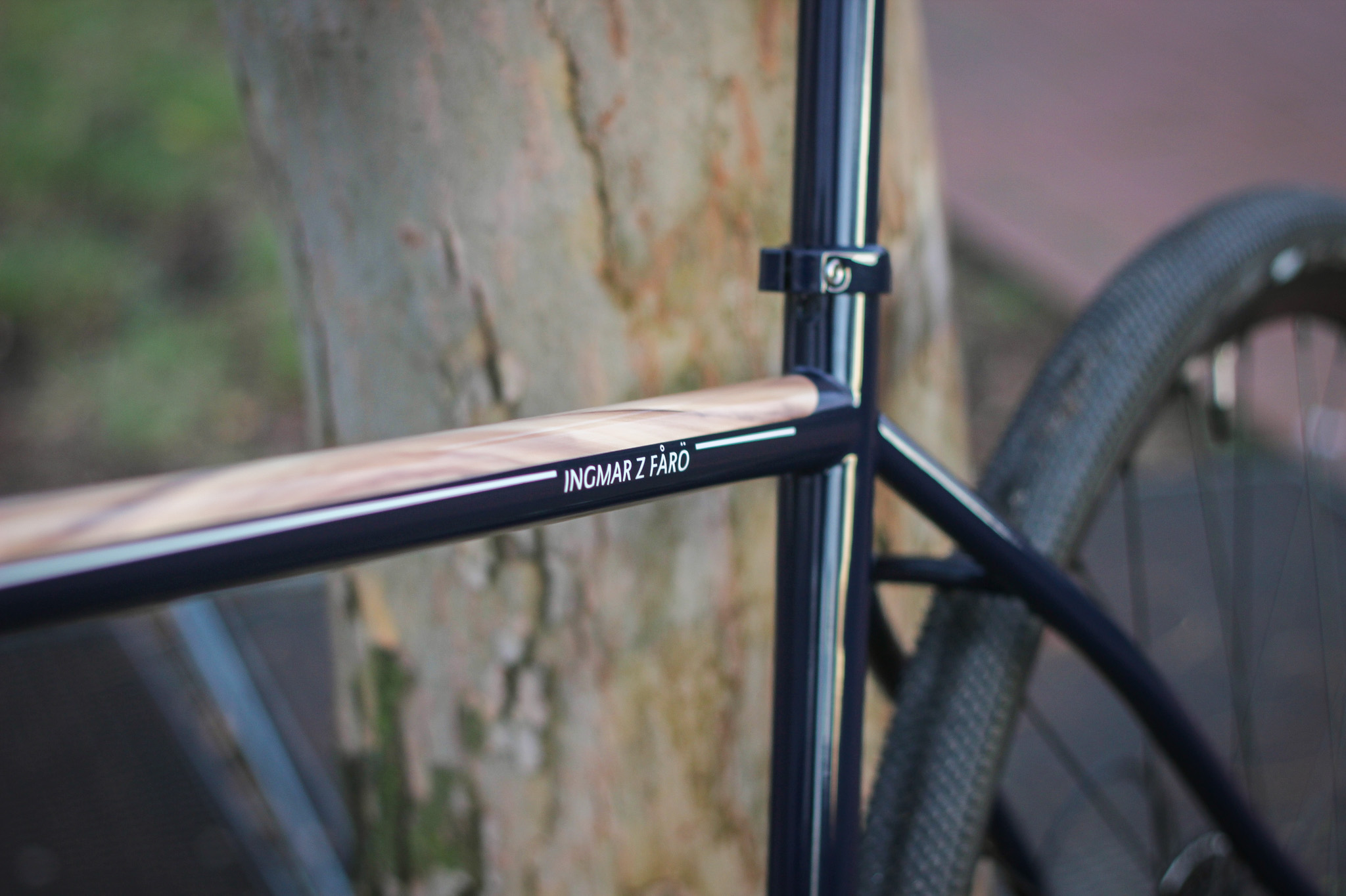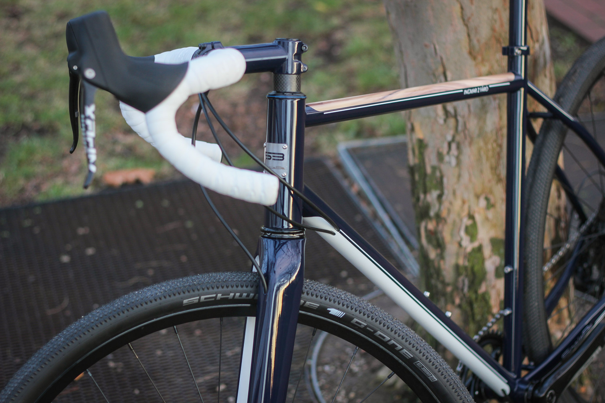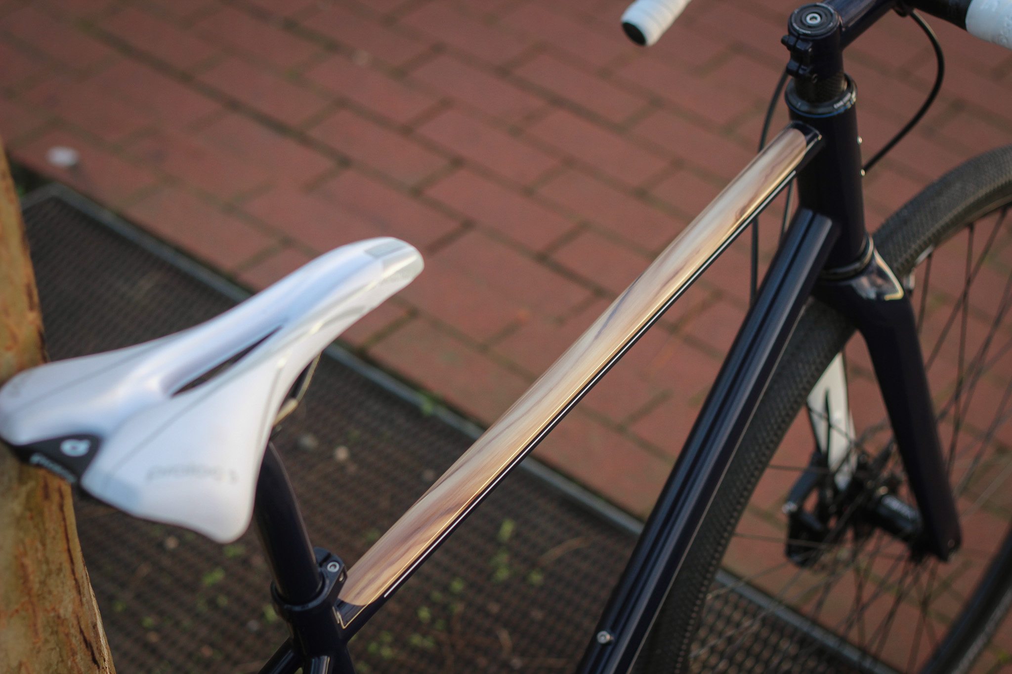 Zakázkový ocelový gravel bike SingleBe Swan 115. Ocelový rám Reynolds se zadní stavbou Dedacciai, vnitřní vedení hadiček a bowdenů. Design inspirovaný luxusní jachtou Swan 115, kde je na horní rámové trubce lakovaná imitace týkového dřeva.