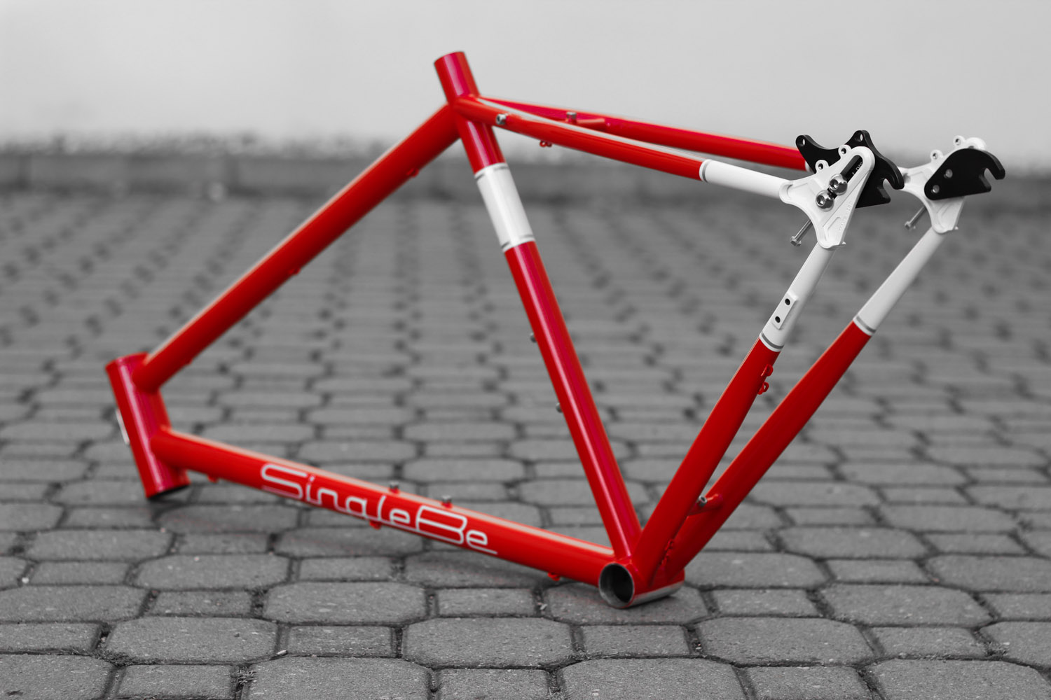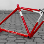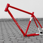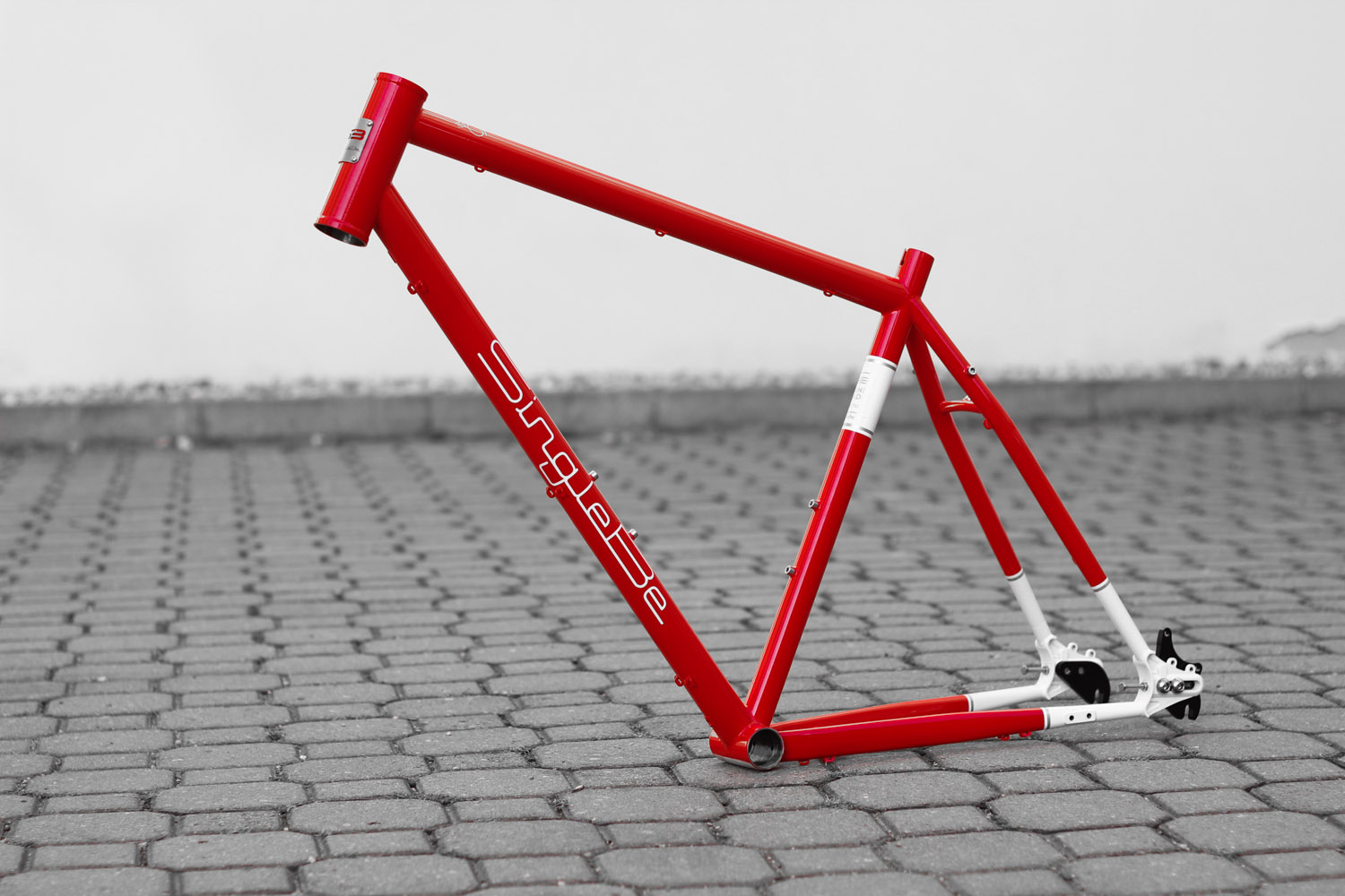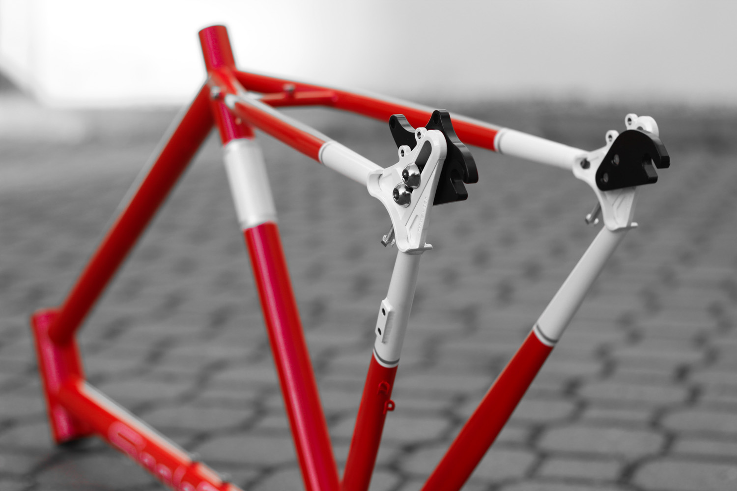Rámový set (rám včetně vidlice) z materiálu Reynold 631 (zadní stavba Reynolds 725). Rám je připravený na použití vícerychlostního náboje Rohloff díky dopínacím patkám Tange Sliding.