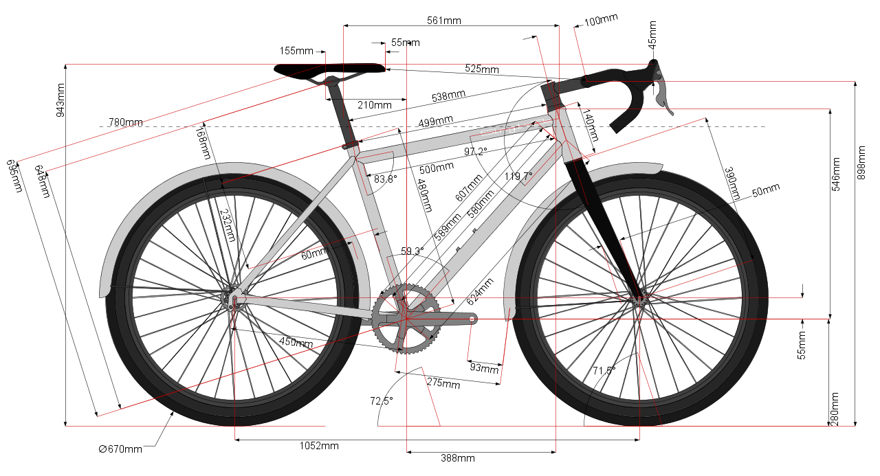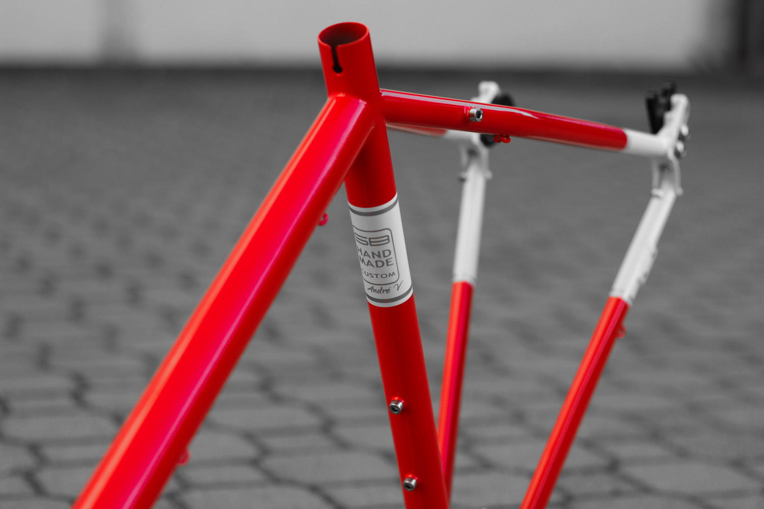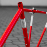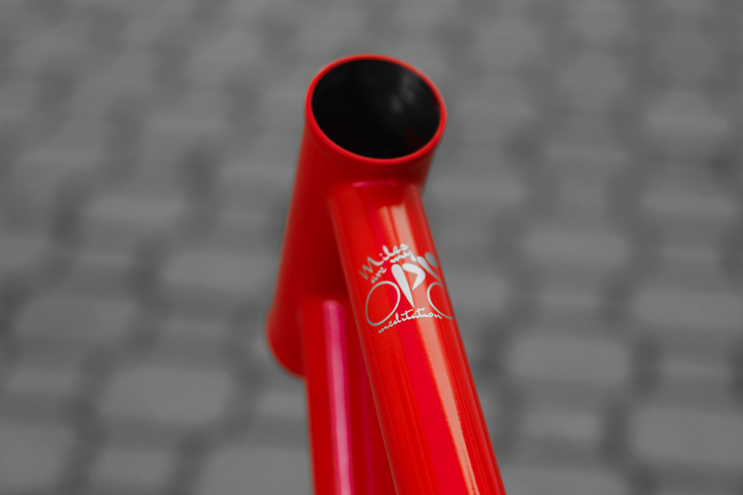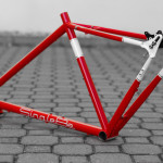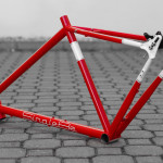 Rámový set (rám včetně vidlice) z materiálu Reynold 631 (zadní stavba Reynolds 725). Rám je připravený na použití vícerychlostního náboje Rohloff díky dopínacím patkám Tange Sliding.