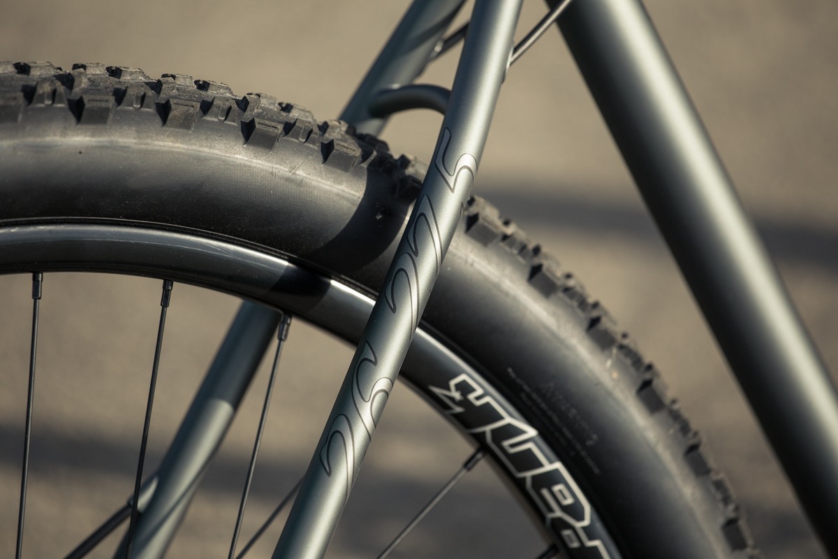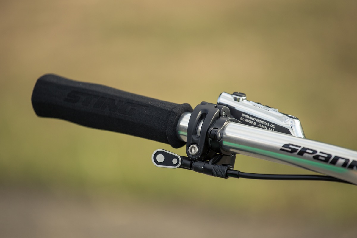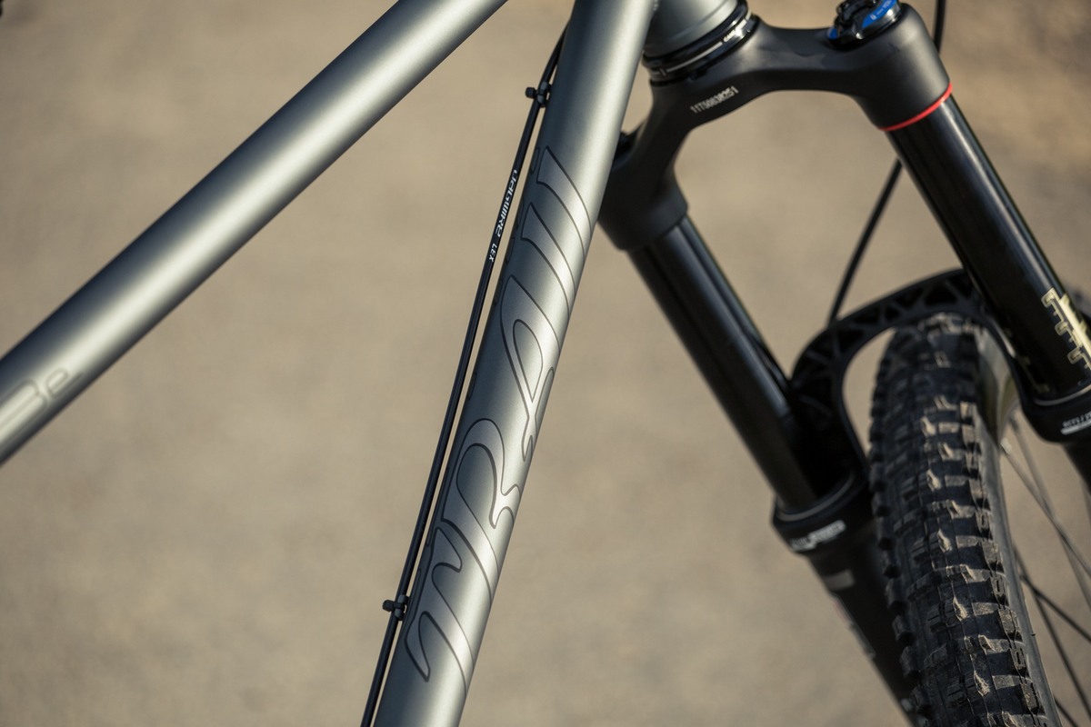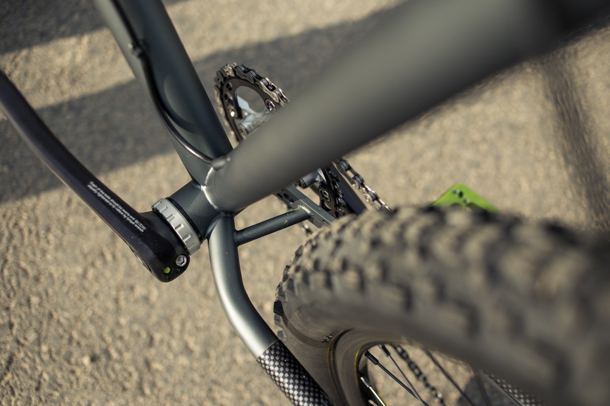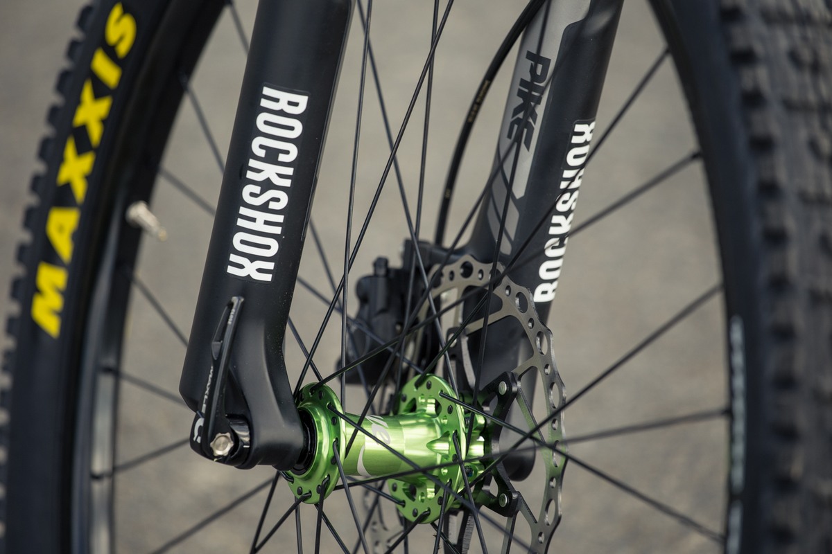 Matná šedá barva pochází z nějakého modelu od automobilky UAZ : ) a loga jsou lakované s konturovým okrajem. Designově je rám méně nápadný, tak aby vynikly zelené eloxované díly.