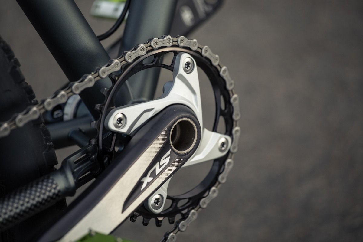 Zadní stavba nabízí opravdu velkou průchodnost i na Maxxisáka Ardent v rozměru 2.4″ a nechybí zde patky 142X12 s vlastním singlebe nerezovým hákem na přehazovačku Shimano XT s brzdou Shadow Plus.