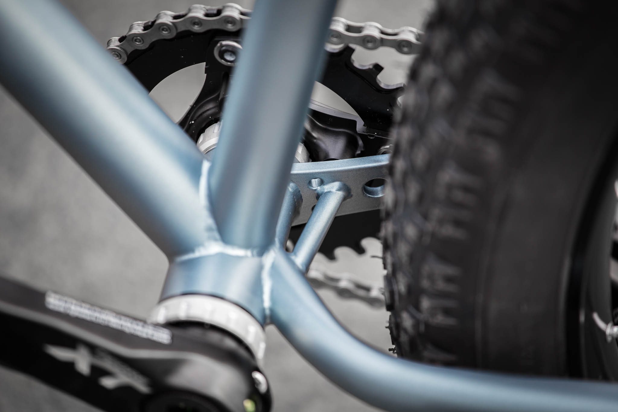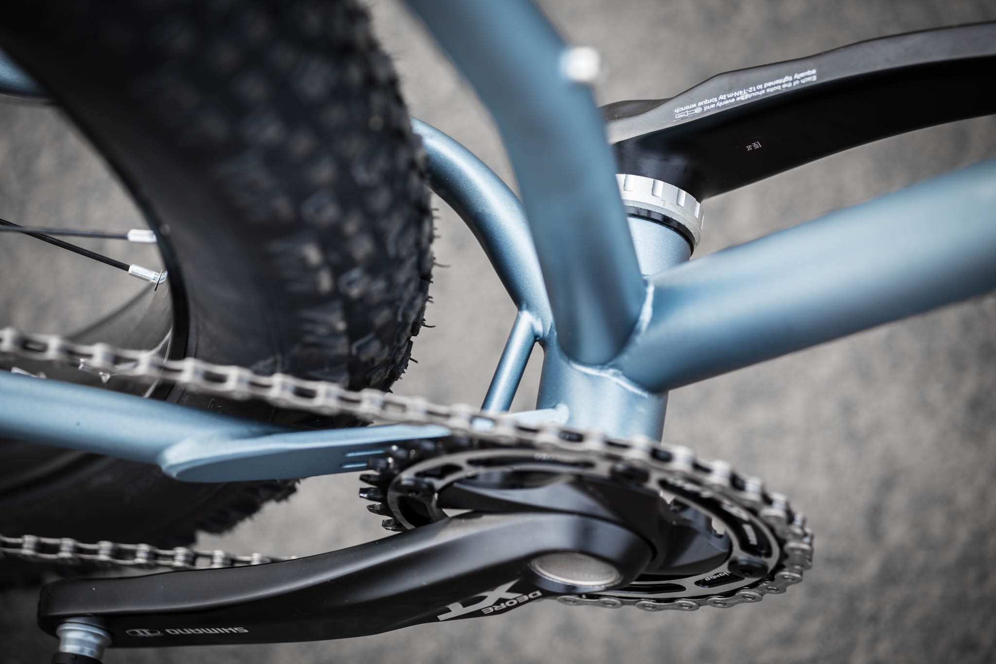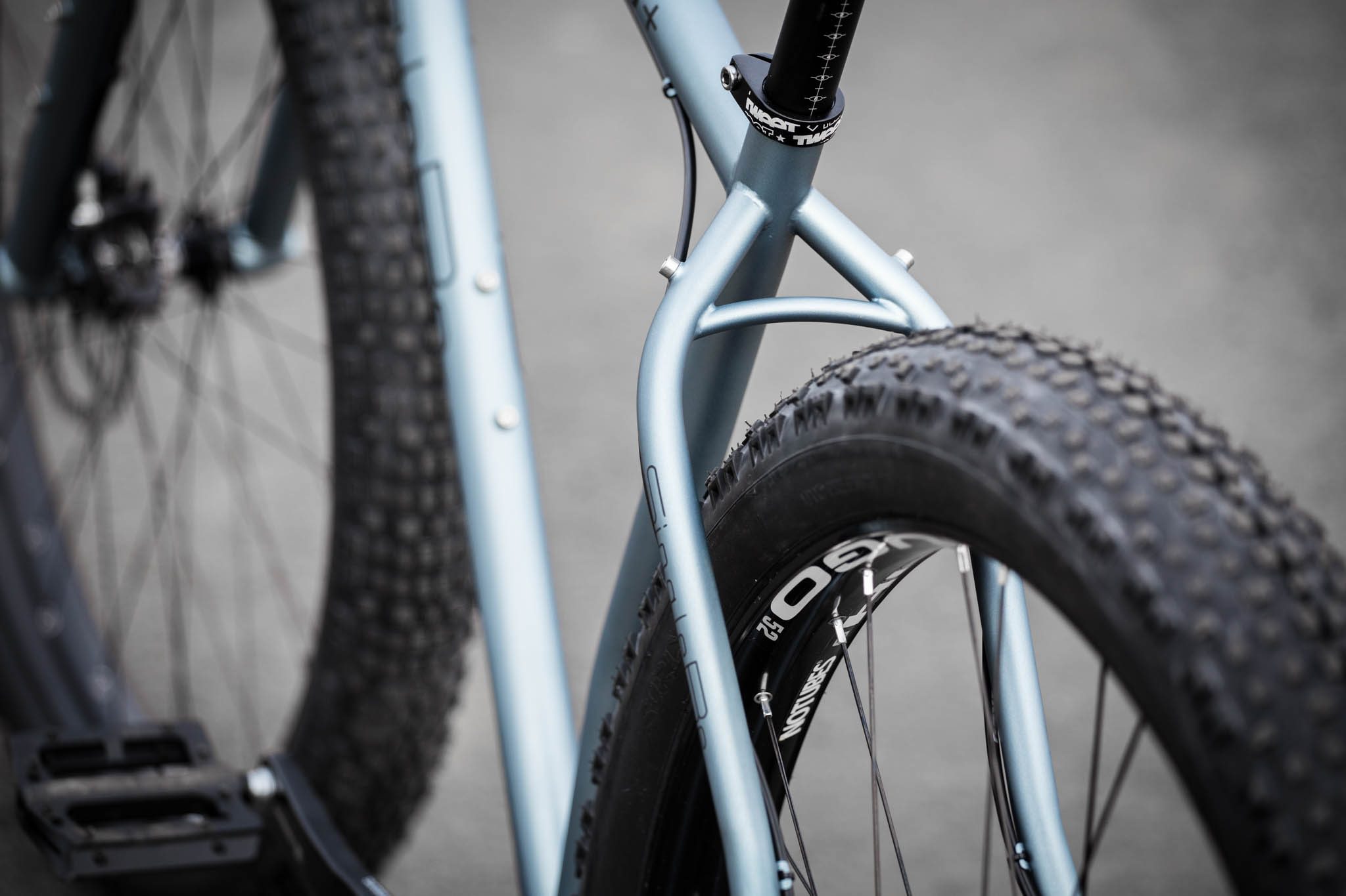 Díky designu oblasti za šlapacím středem vzniklo dostatek prostoru na pláště 29+ (Surly Knard 78 mm široký) a také na převodník o velikosti až 36z na pozici třetího převodníku (řet. linka 57 mm).