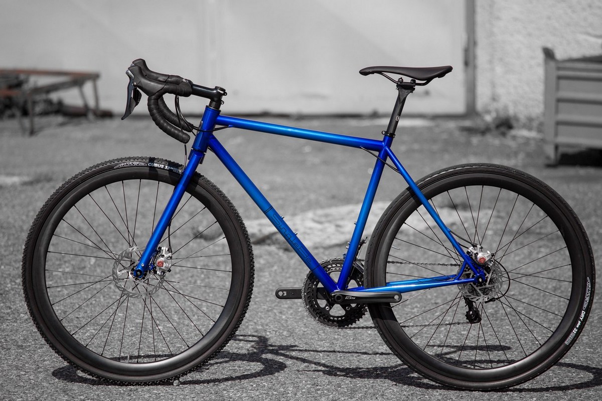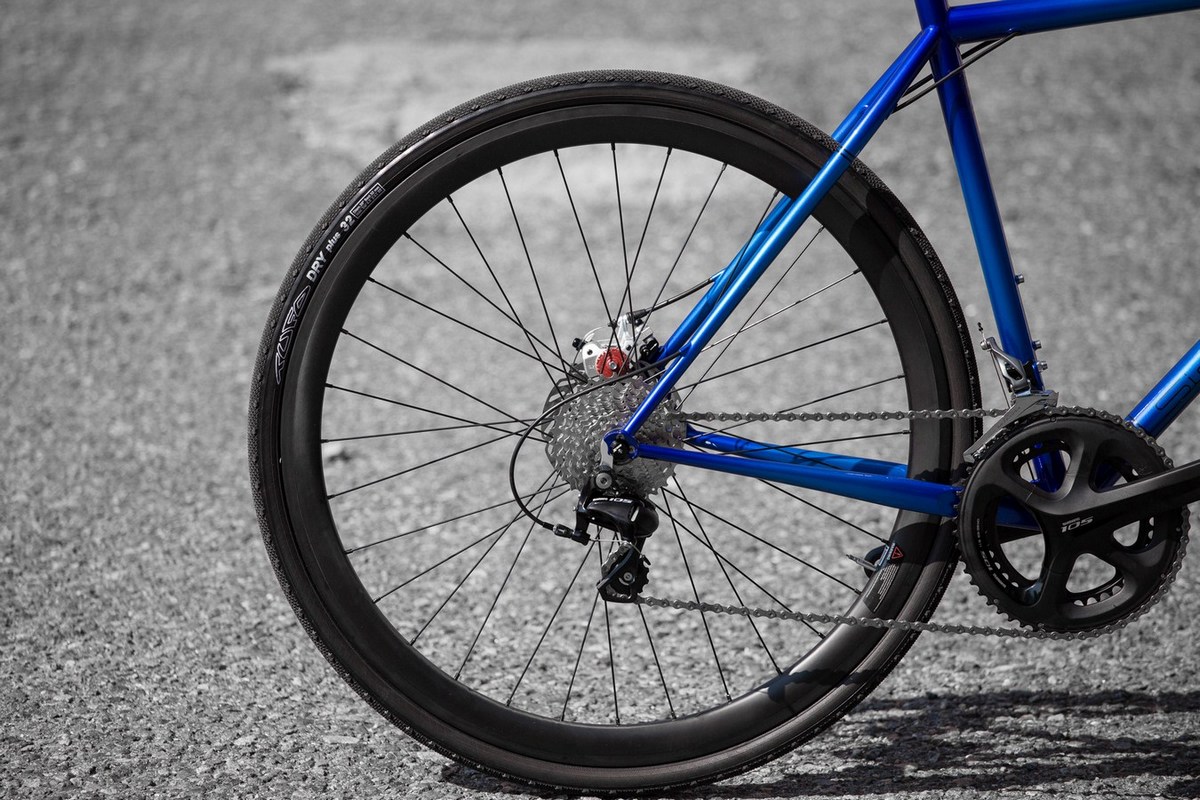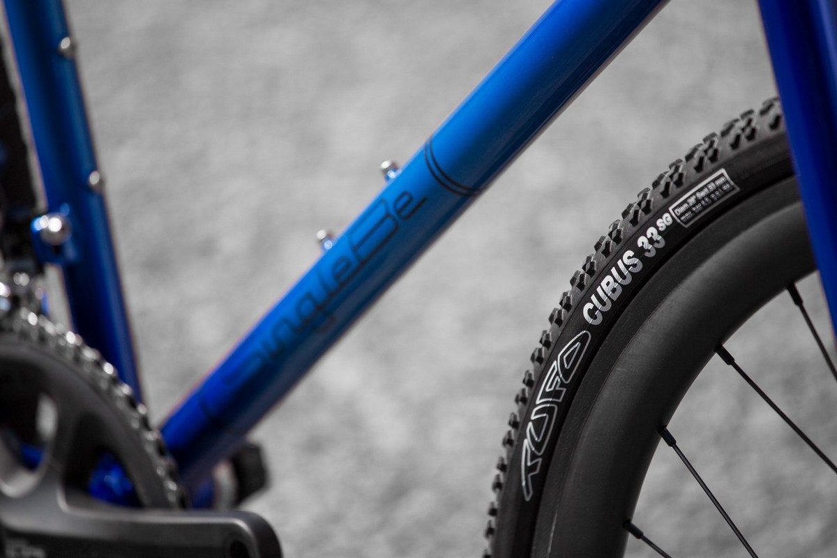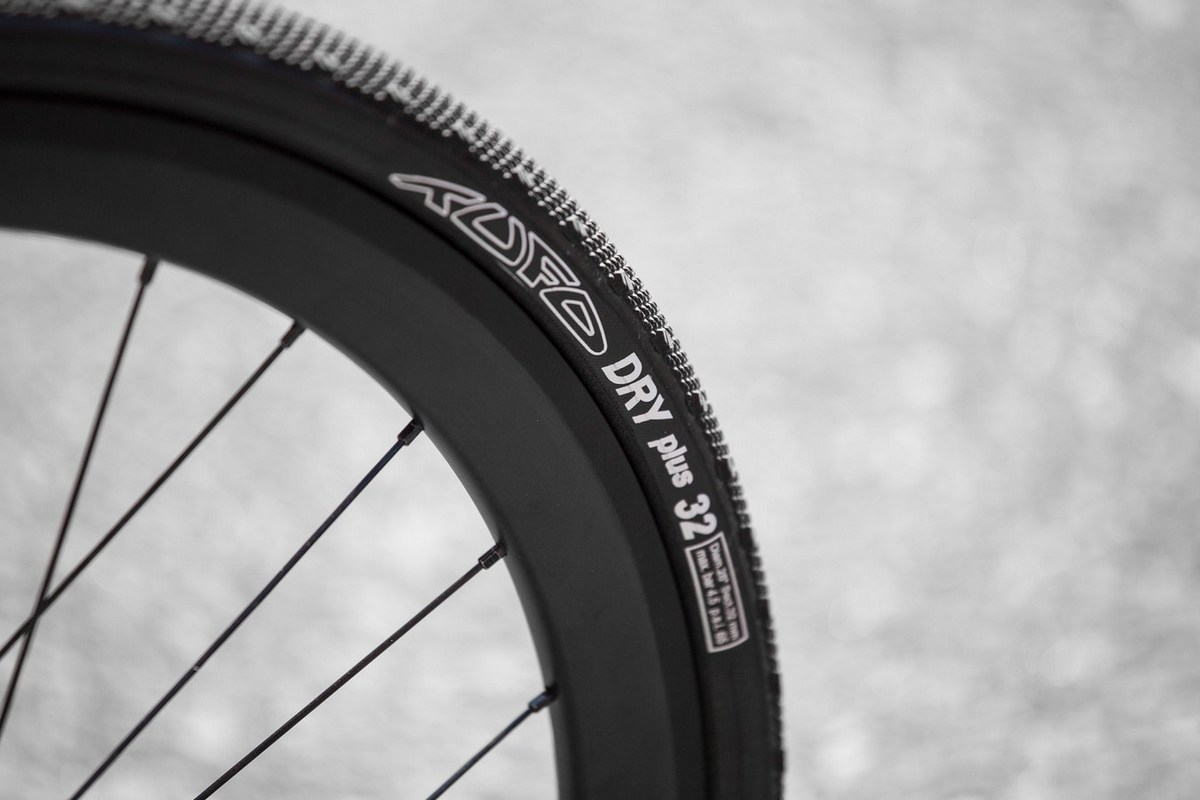 Kola jsou zapletená na 38 mm vysokých karbonových ráfcích se širokým „wide – U“ profilem. Galusky od českého výrobce TUFO, vpředu pro vedení stopy hrubší Cubus 33mm a vzadu Dry Plus 32mm (předek vede zadek jede). Dále jsou na kole osazena karbonová řidítka a karbonová sedlovka singlebe s našim logem.